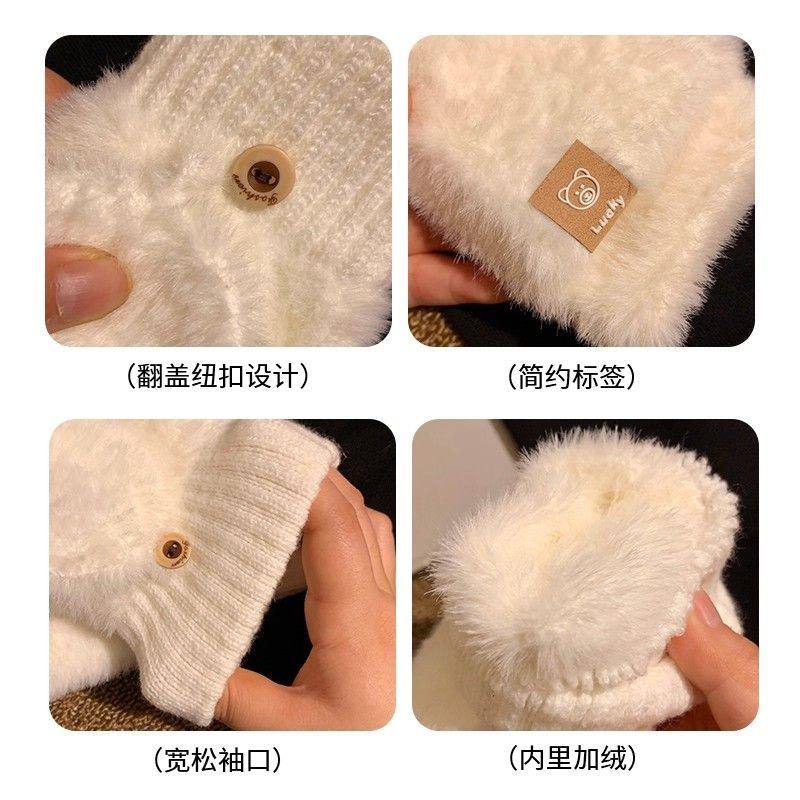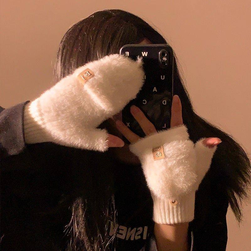 新款露指翻盖毛绒保暖手套女冬季可爱防寒骑车加厚触屏情侣款半指