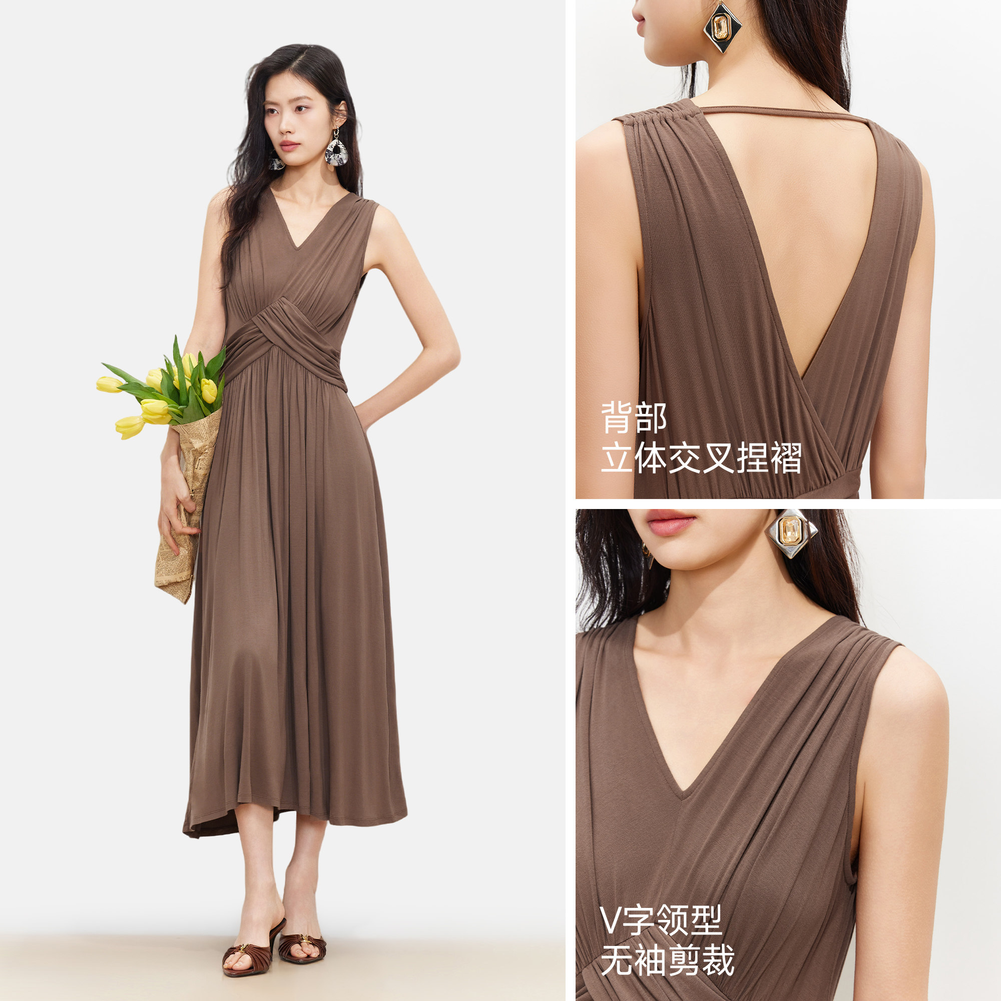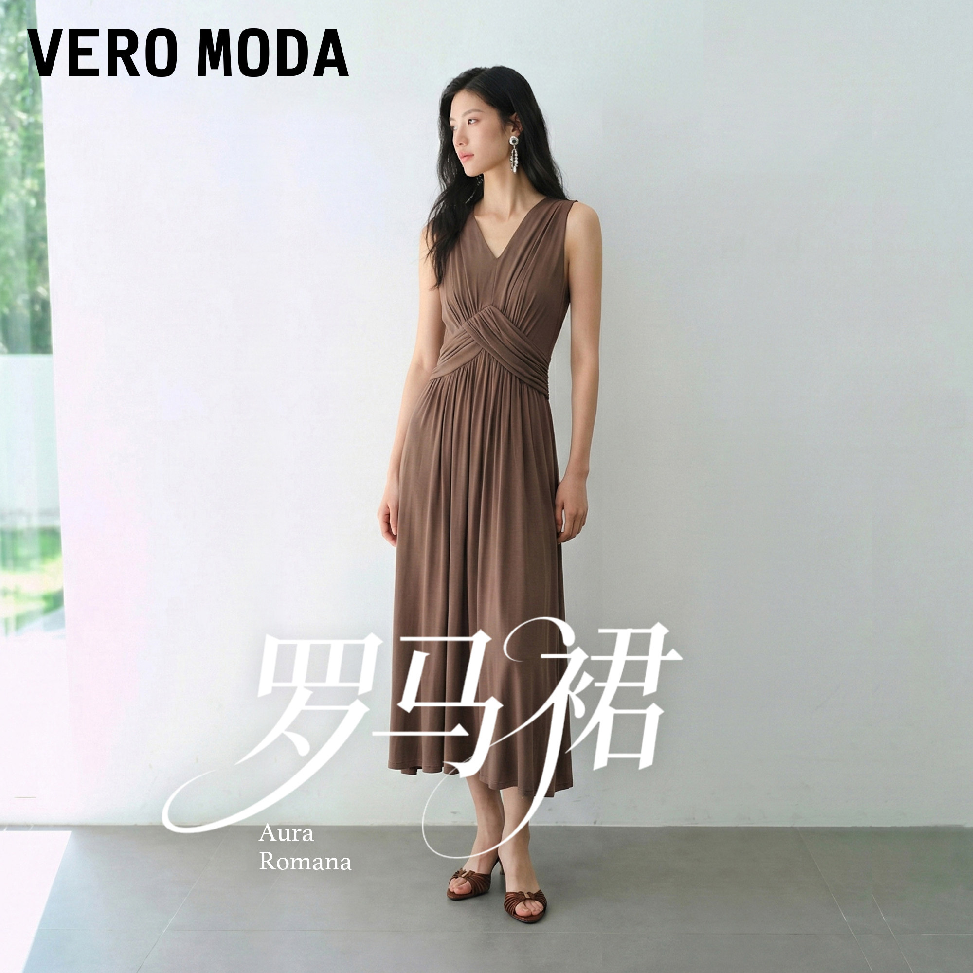 【罗马裙】VeroModa连衣裙女26夏季无袖V领捏褶收腰通勤长裙优雅