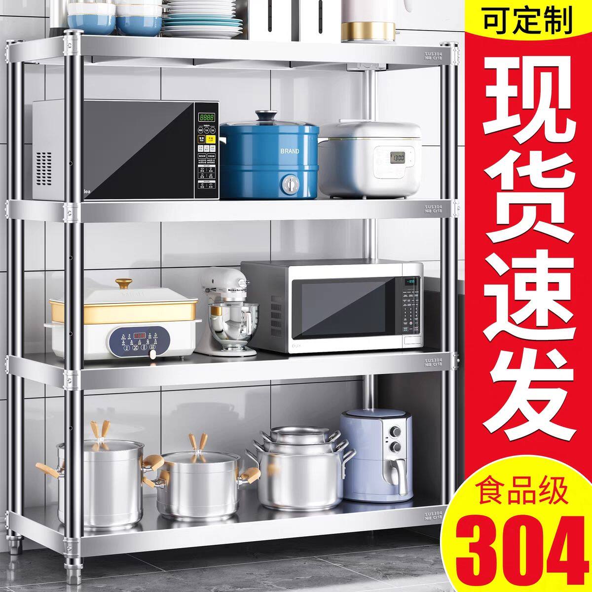 加厚304不锈钢厨房置物架落地多层货架微波炉烤箱收纳储物架锅架