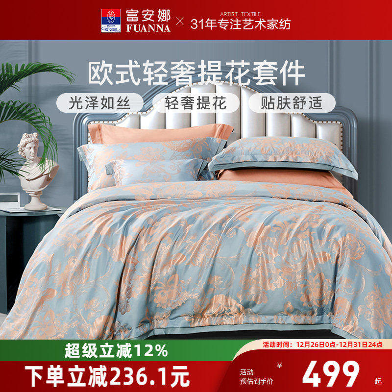 富安娜家纺提花四件套轻奢纯棉简约床单被套双人被罩高级床上用品