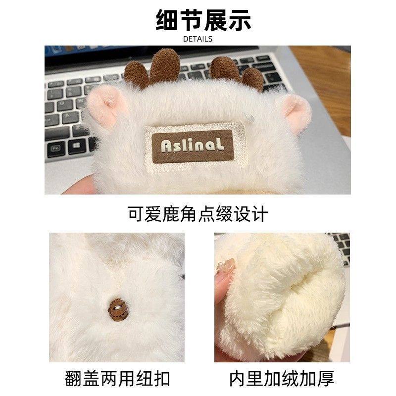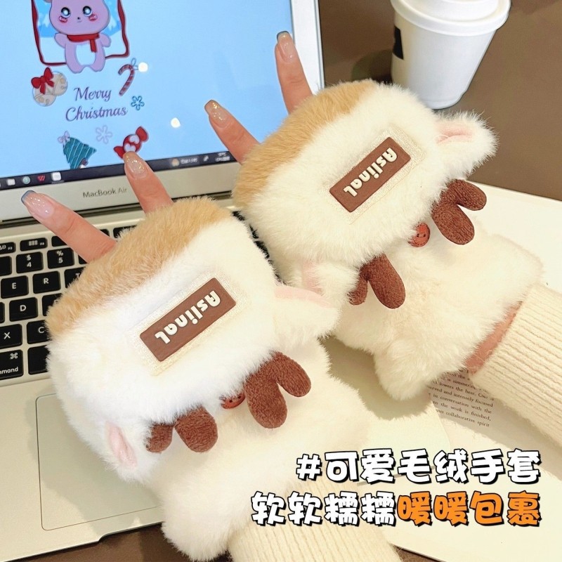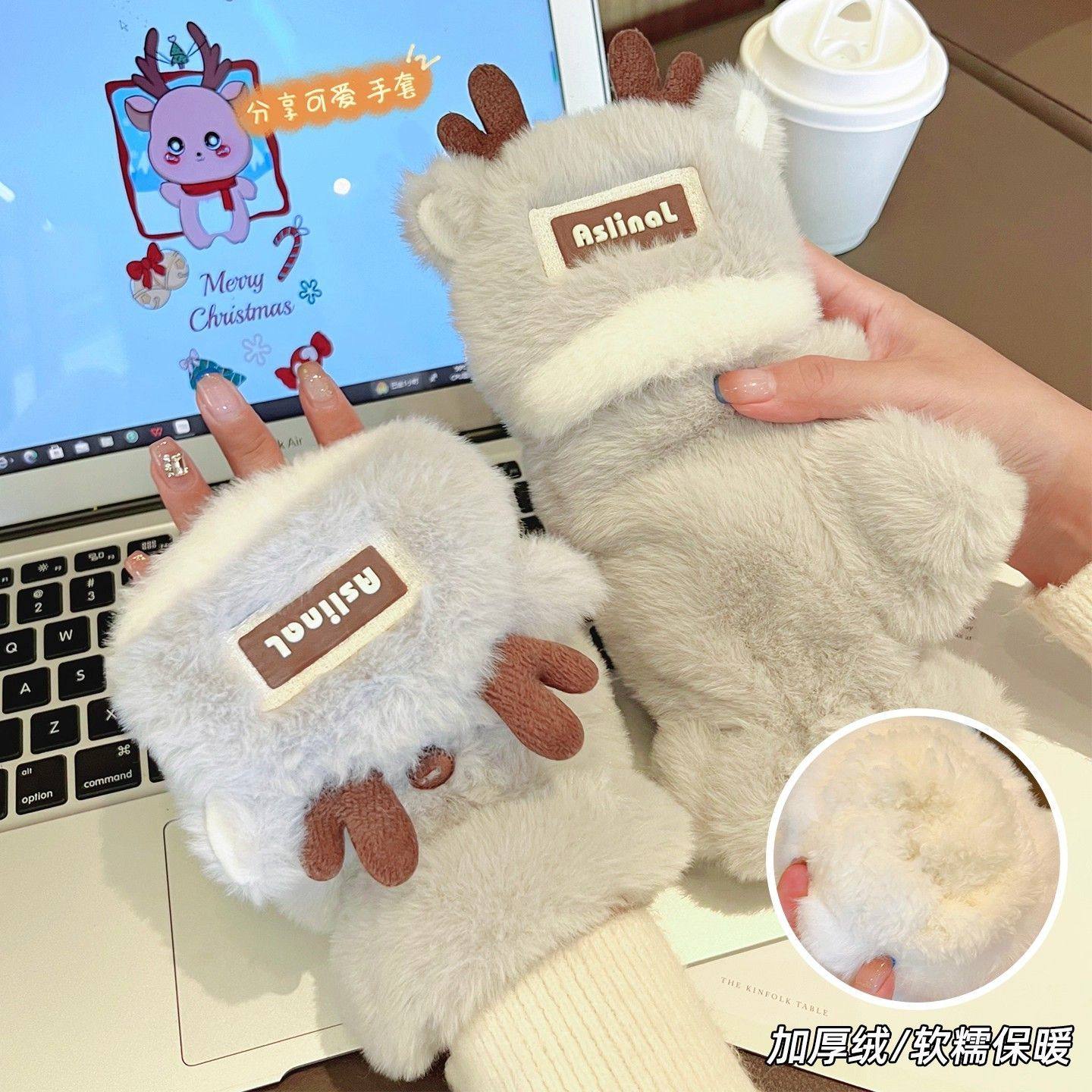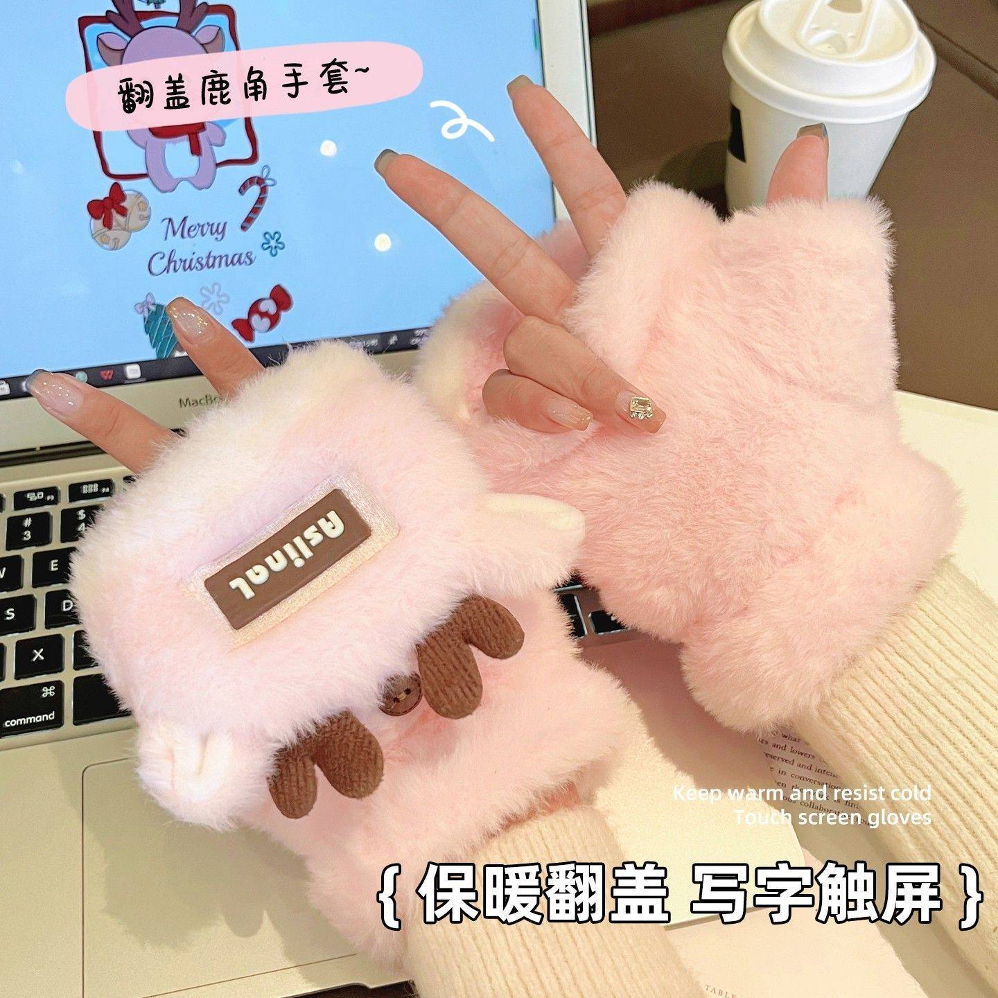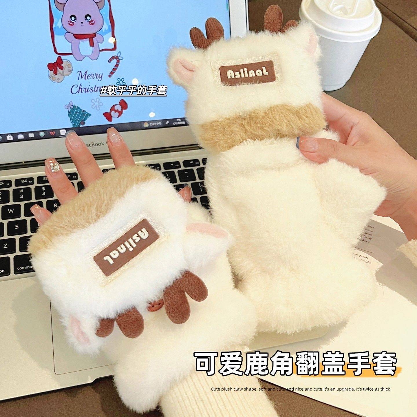 可爱鹿角毛绒手套女冬季加绒加厚保暖学生骑车防寒半指毛绒绒翻盖