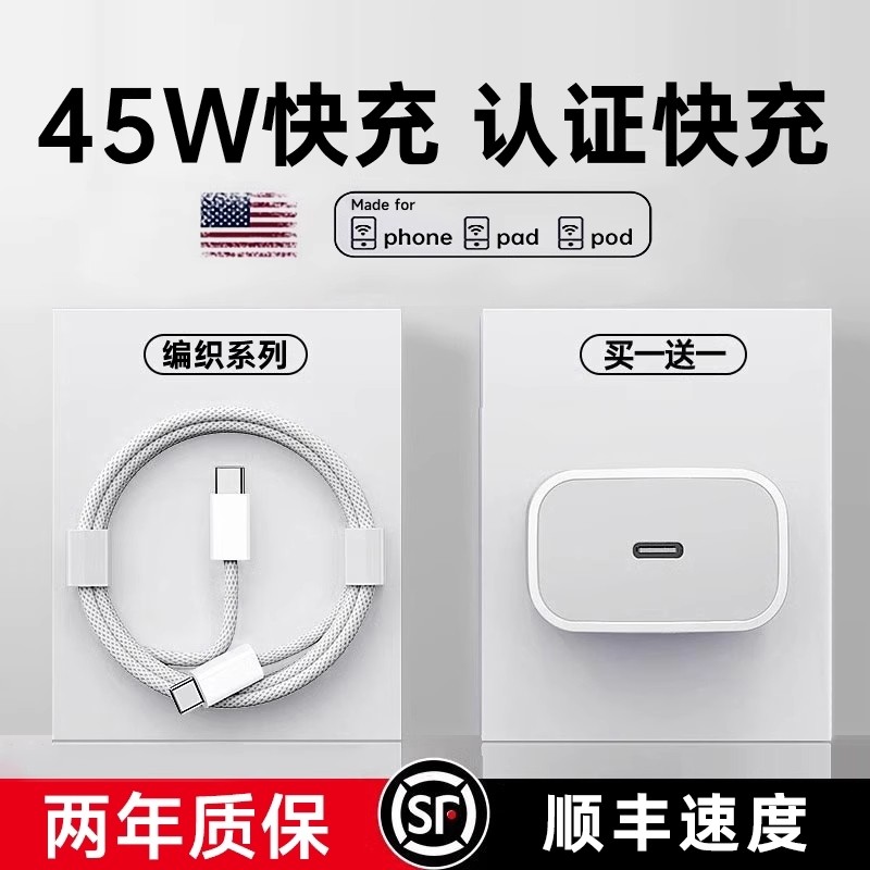 【国家3C认证】45W快充适用苹果充电器头iPhone17/15/14/13/12ProMax手机PD原装数据线16插头iPad一套装正品