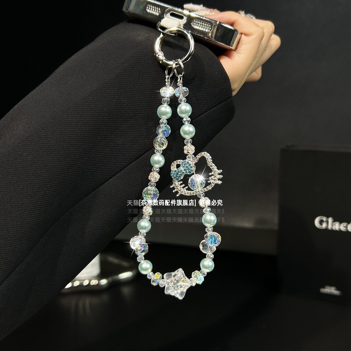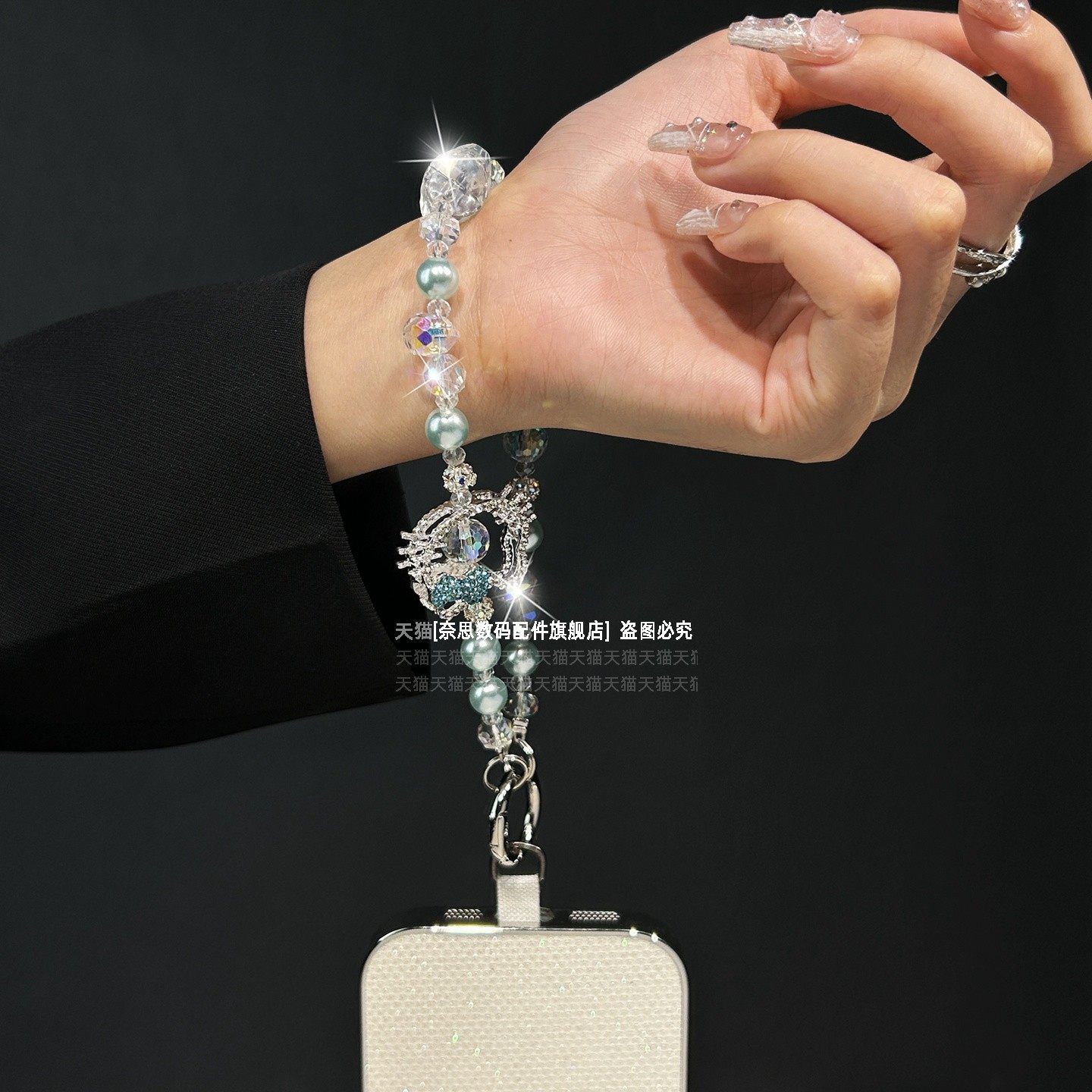 可爱镶钻猫咪手机链少女心精致爆闪水晶挂饰手工串珠韩系网红链条短款手链高级珍珠防丢手腕挂链绳腕带垫片壳