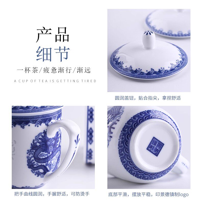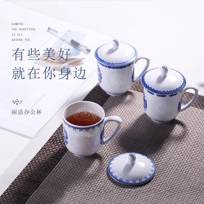 景德镇青花玲珑茶杯家用带盖水杯马克杯陶瓷办公杯泡茶杯子大容量