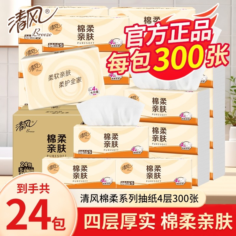 清风原木抽纸4层加厚面巾纸餐巾纸家用实惠装卫生纸擦手亲肤细滑