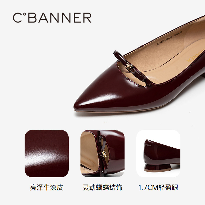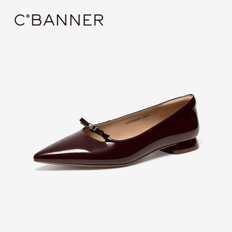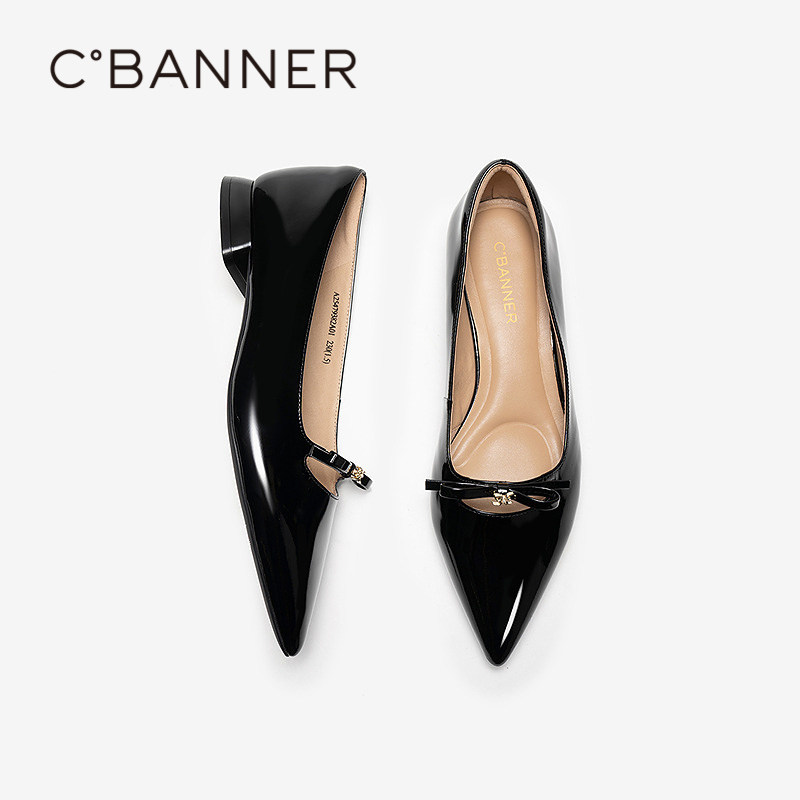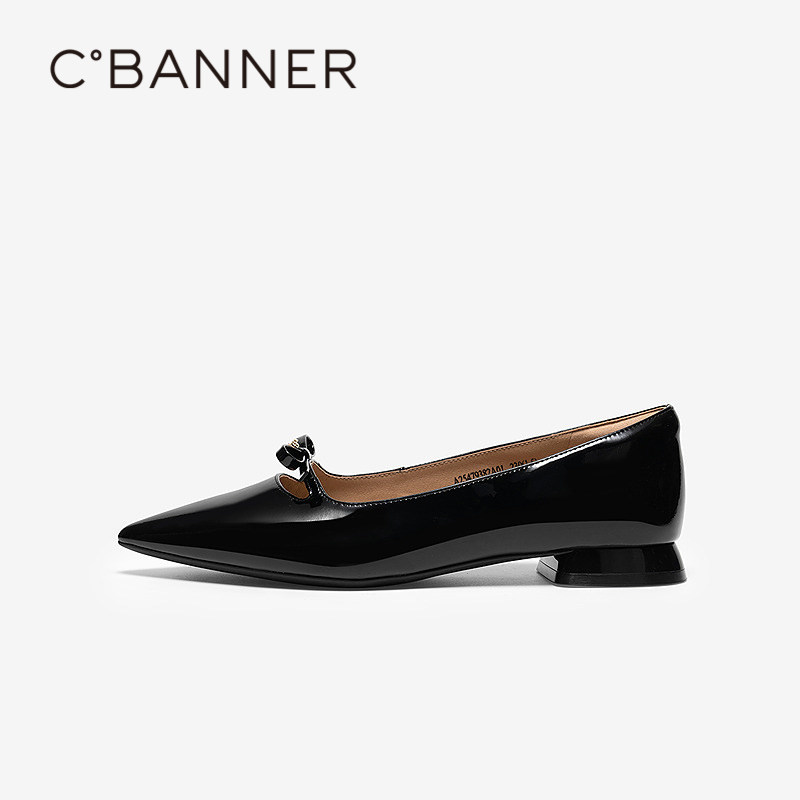 千百度低跟漆皮蝴蝶结浅口单鞋女2025秋季新款正装通勤真皮晚晚鞋
