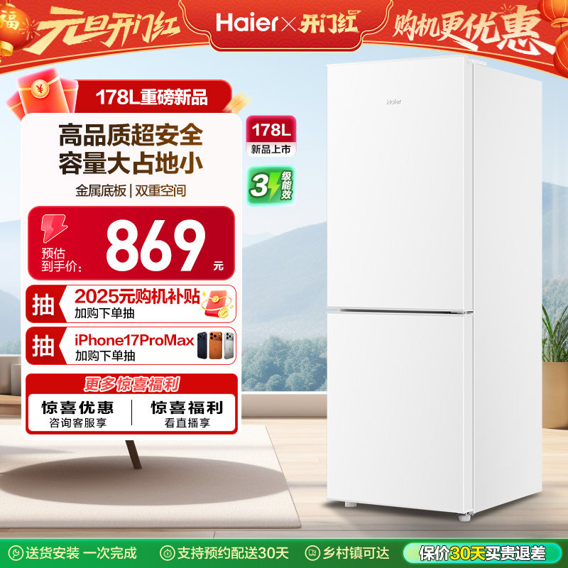 海尔178L双开两门冷藏冷冻家用小型出租房官方宿舍白色小冰箱