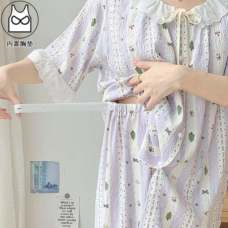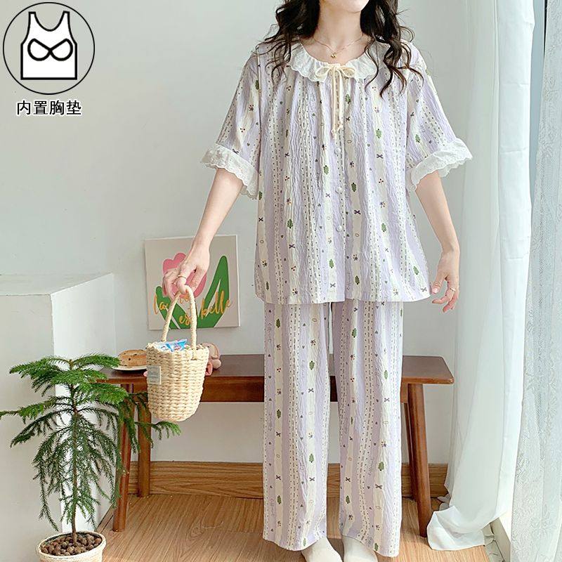婧麒带胸垫月子服夏季薄款产后哺乳喂奶睡衣女孕妇睡衣短袖长裤