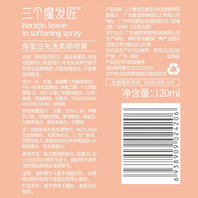 三个魔发匠改善毛躁柔顺蓬松免洗护发素喷雾120ml起