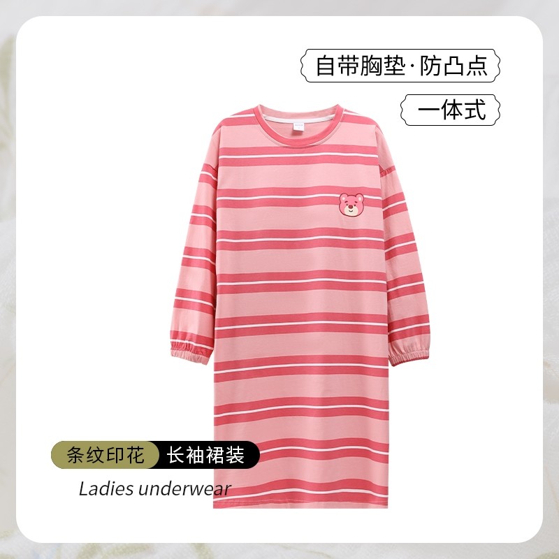 女士纯棉睡衣裙带胸垫春秋季长袖全棉中长条纹裙子休闲舒适可外穿