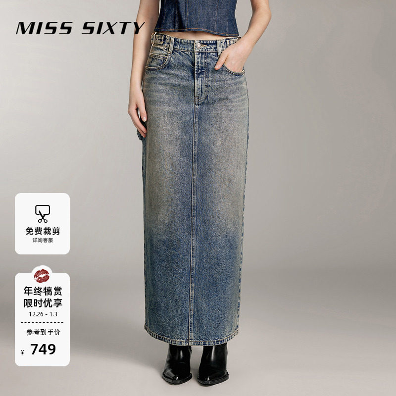Miss Sixty牛仔半身裙女低腰开衩工装裙复古做旧洗水长裙直筒裙