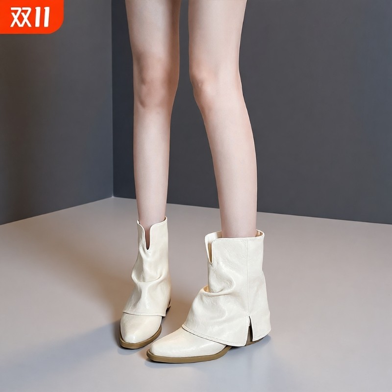 真皮~内增高西部牛仔堆堆靴女2025秋褶皱裤管短靴复古骑士马丁靴