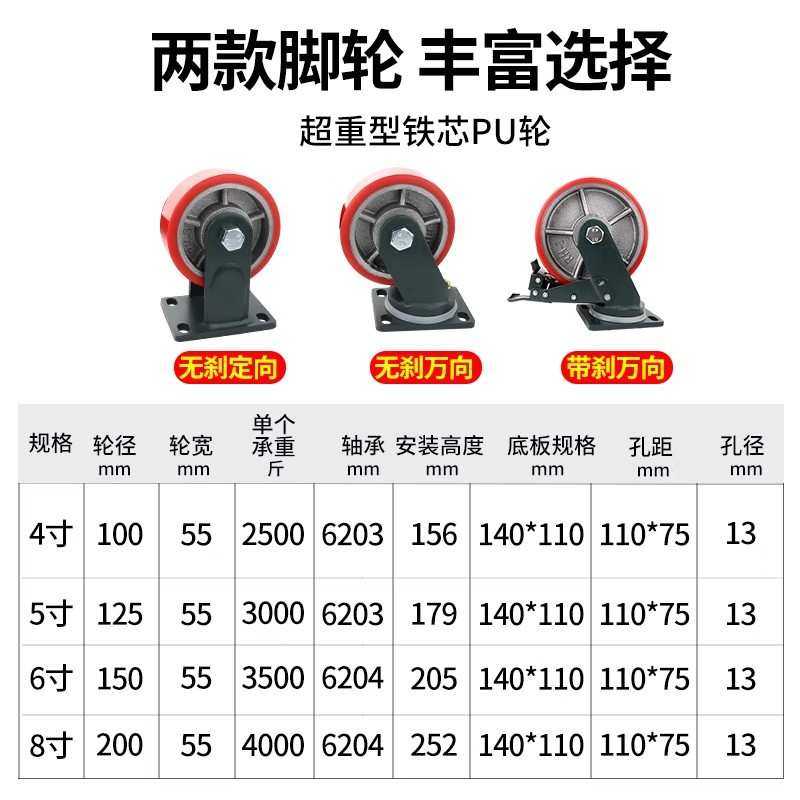 6寸超重型万向轮轮子6寸铁芯聚氨酯脚轮8寸脚轮工业承重1吨轮滑轮