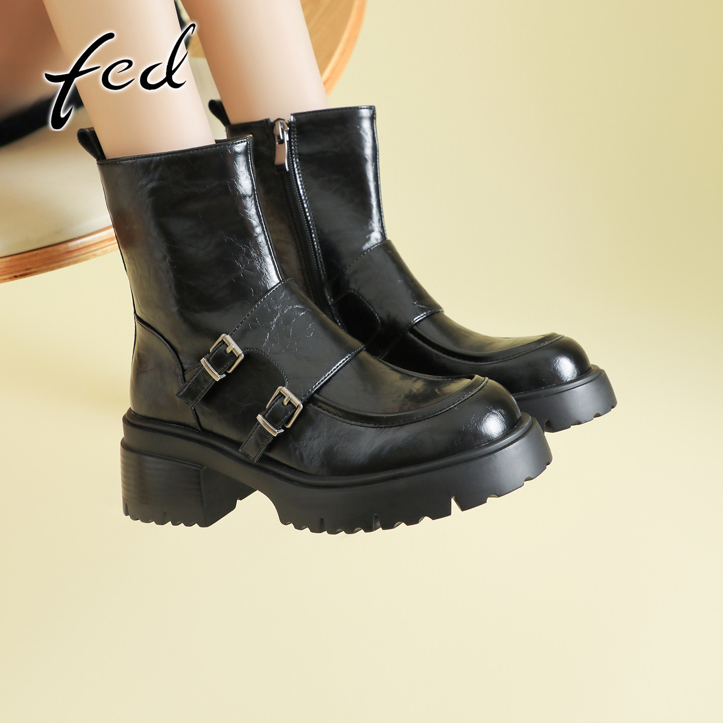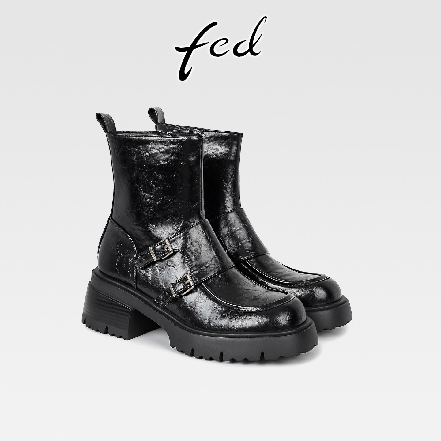 fed复古真皮粗跟厚底皮带扣马丁靴女秋冬新款侧拉链中跟圆头短靴