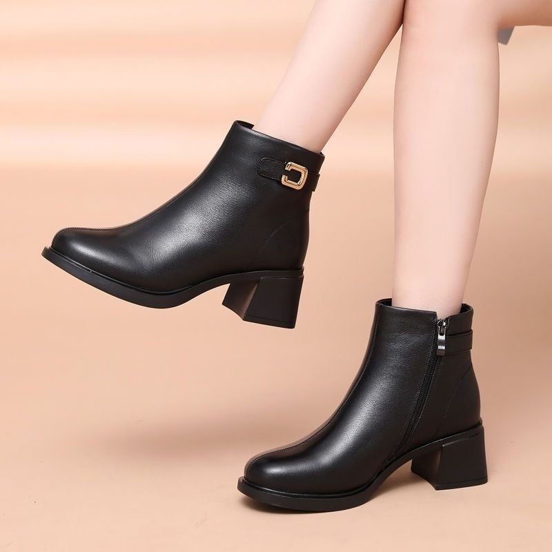 软皮厚底短靴女2025新款妈妈鞋秋冬加绒棉皮靴女粗跟中跟时尚内里