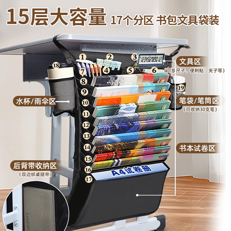 得力大容量课桌收纳袋挂袋初中生挂书袋侧学生书本书袋课桌神器高中生书桌书挂多功能书立放书袋子桌边带定制