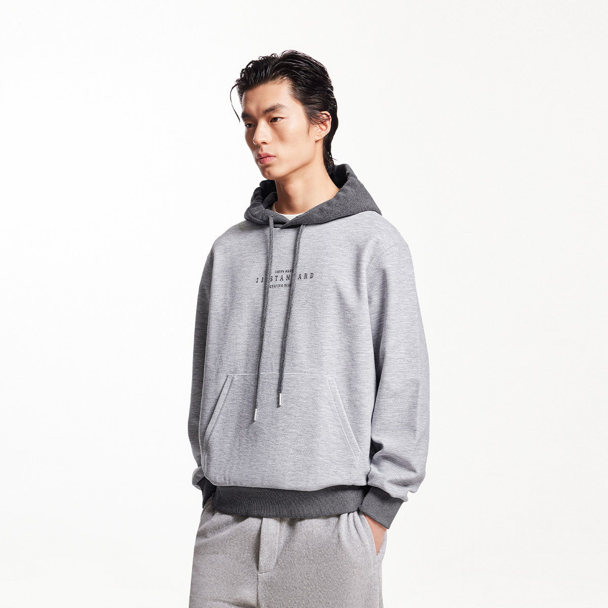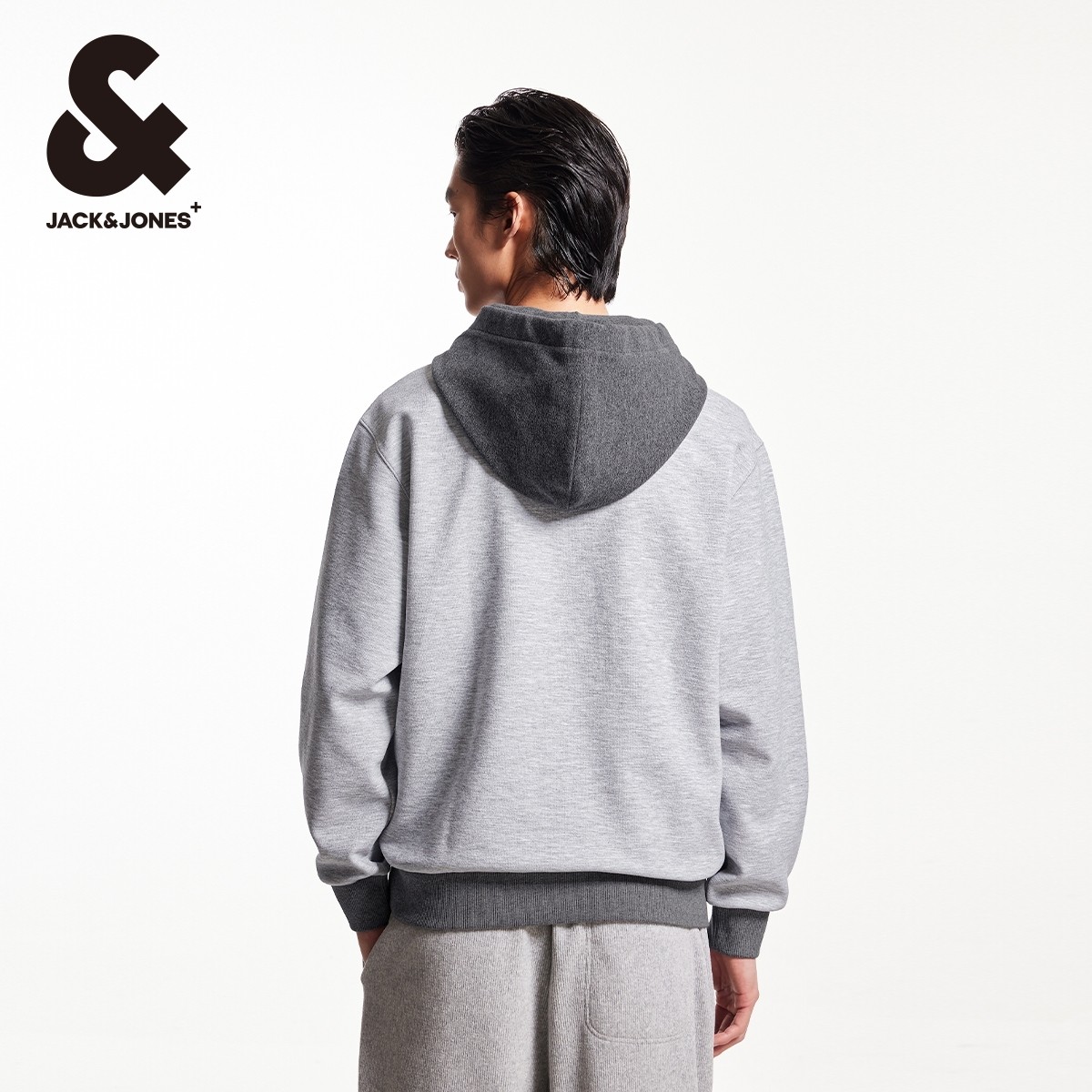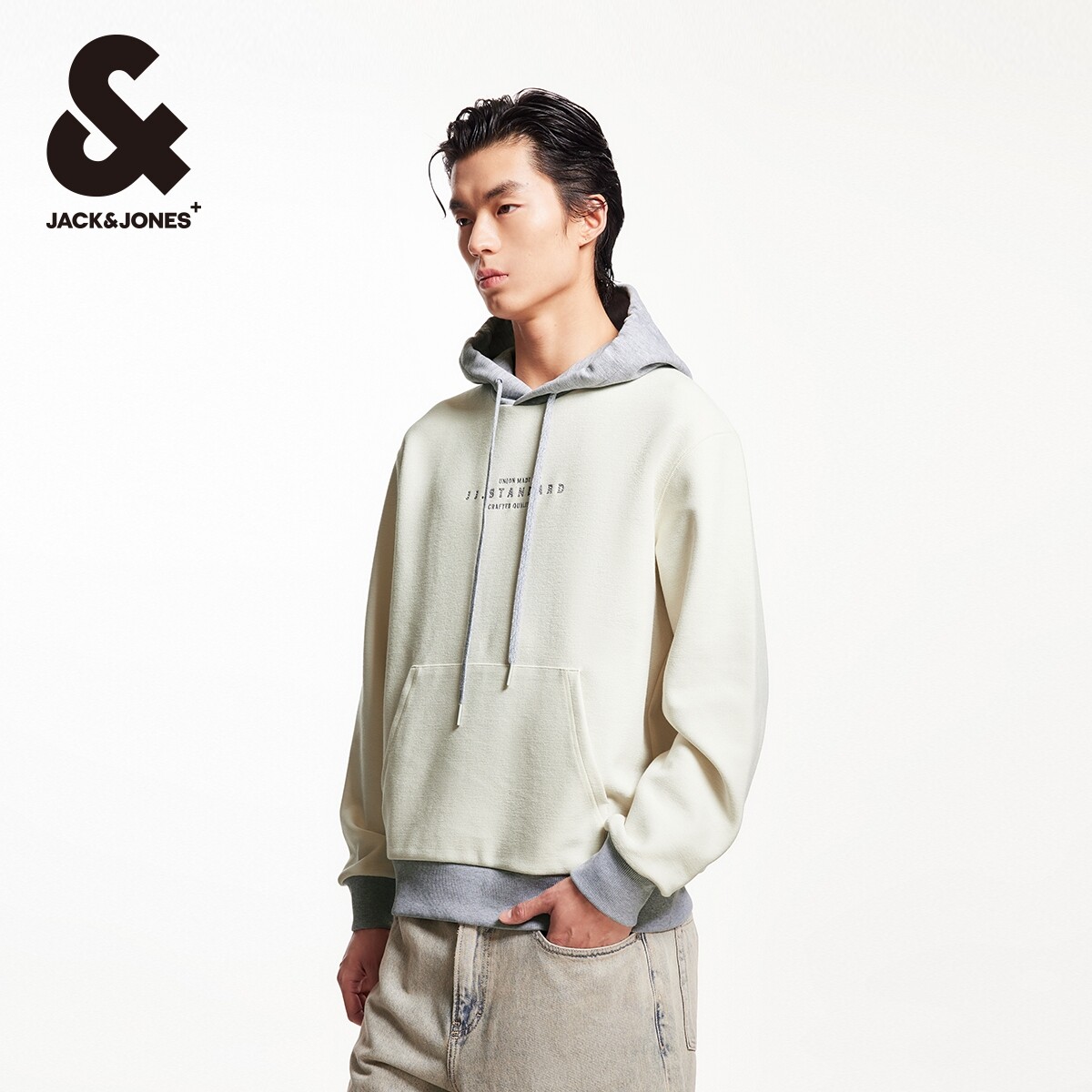 杰克琼斯奥特莱斯春季潮胸前字母刺绣撞色拼接长袖连帽卫衣男装