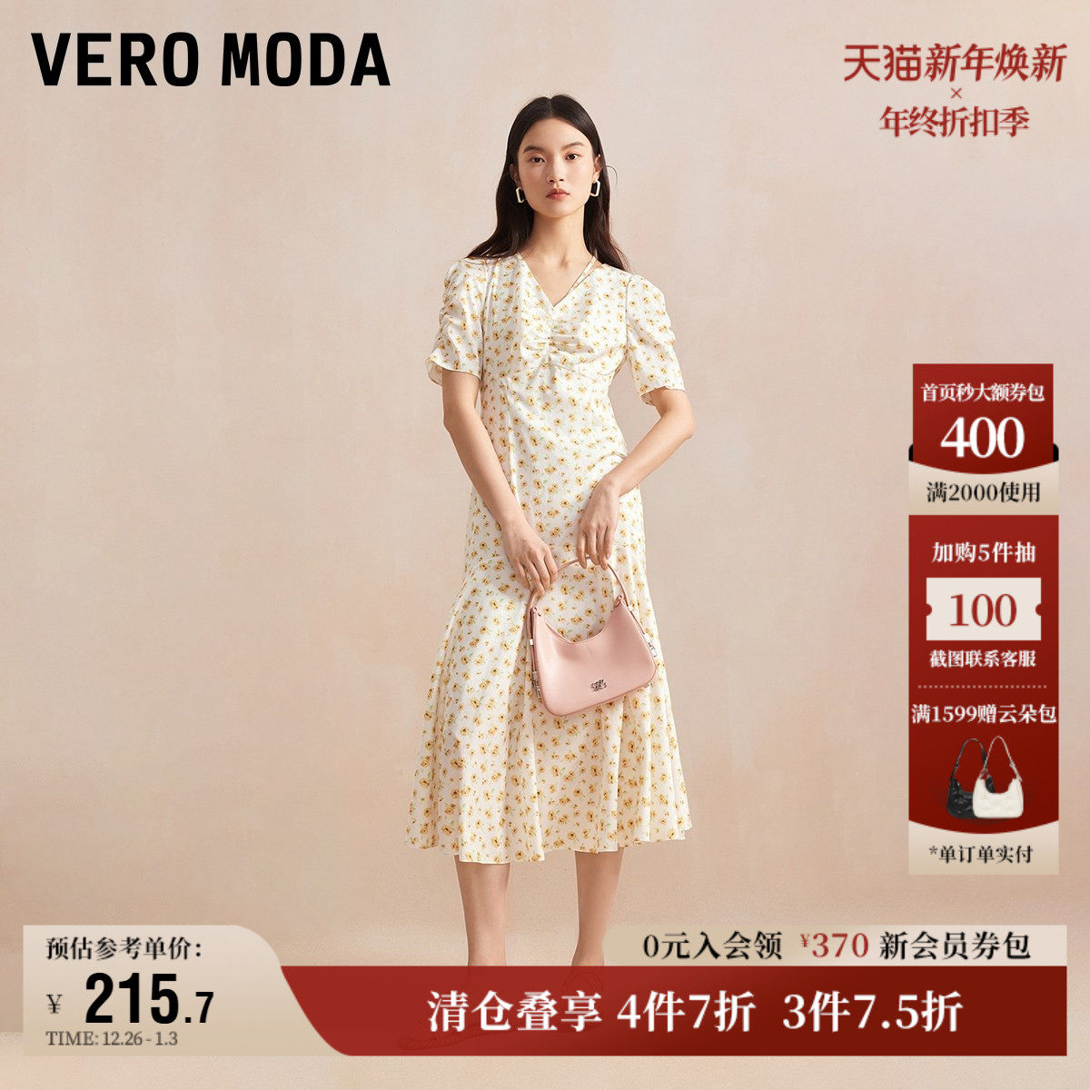 Vero Moda奥莱连衣裙秋季新款五分袖甜美气质薄纱显瘦印花裙子