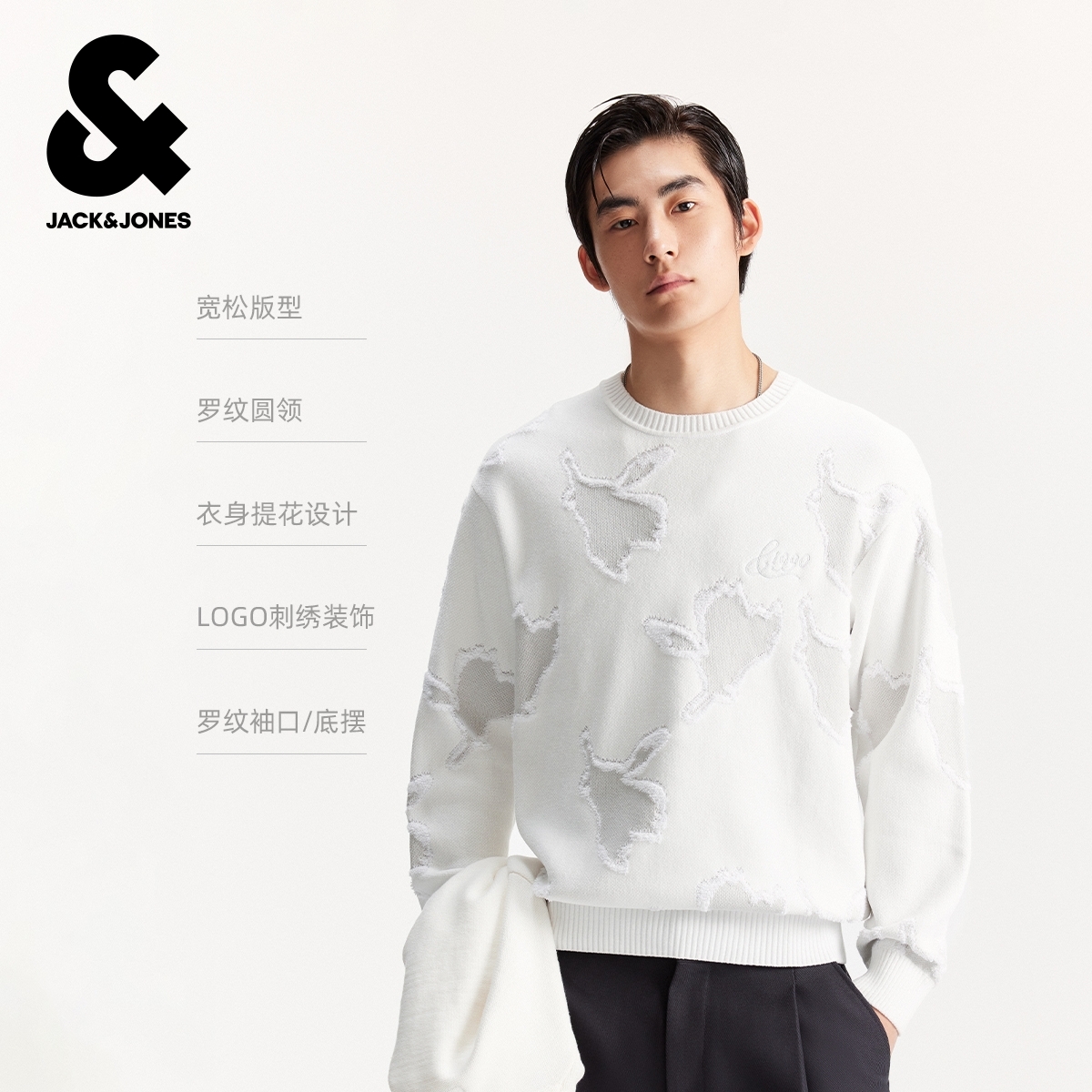 略宽松版型;罗纹圆领、衣身提花设计