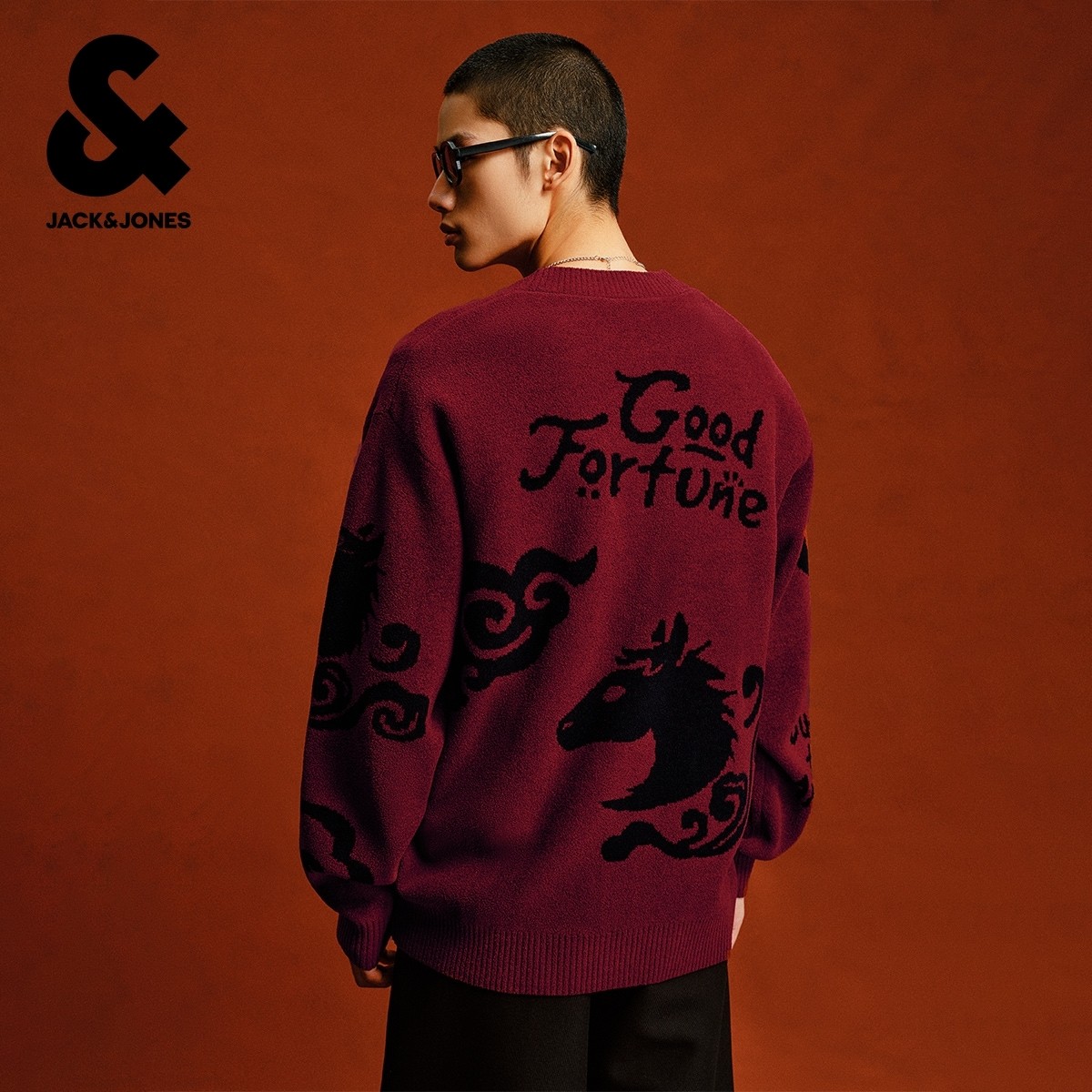 [马年新年款]杰克琼斯男装红色雪尼尔混纺毛衣暗纹刺绣宽松针织衫