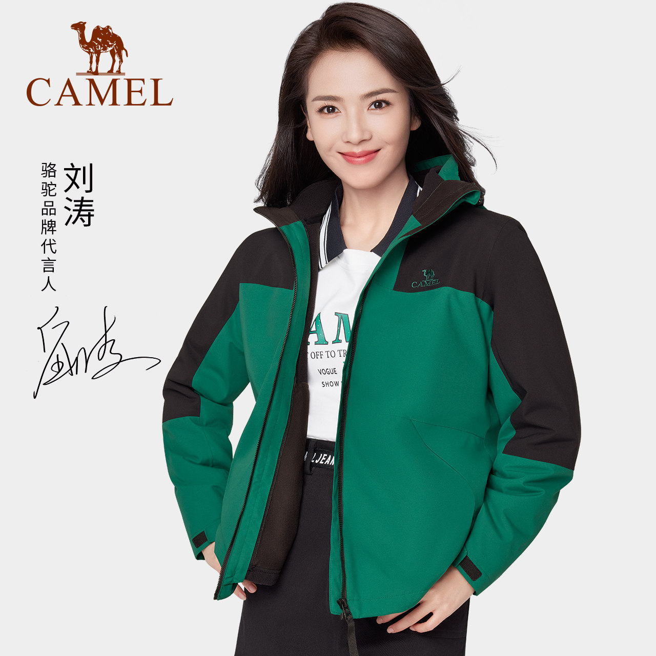 刘涛明星同款骆驼冲锋衣男女三合一可拆卸2021款户外防水拼色外套
