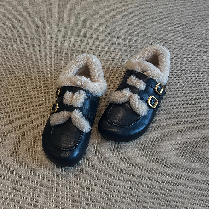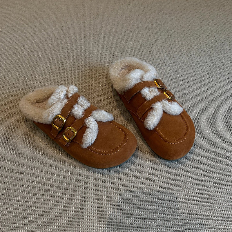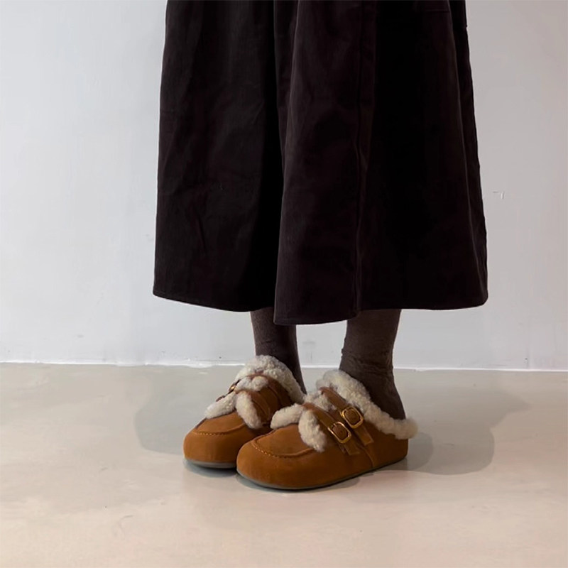 娆娆吴皮带扣一脚蹬外穿拖鞋女秋冬新款半包毛毛博肯鞋女单鞋E07