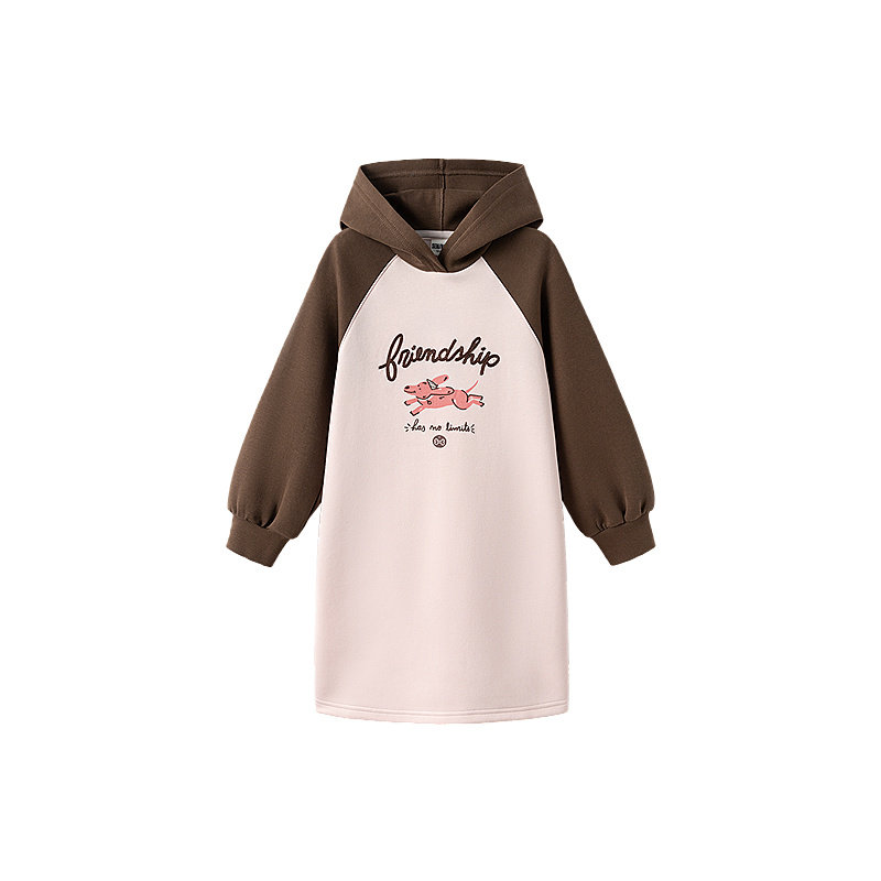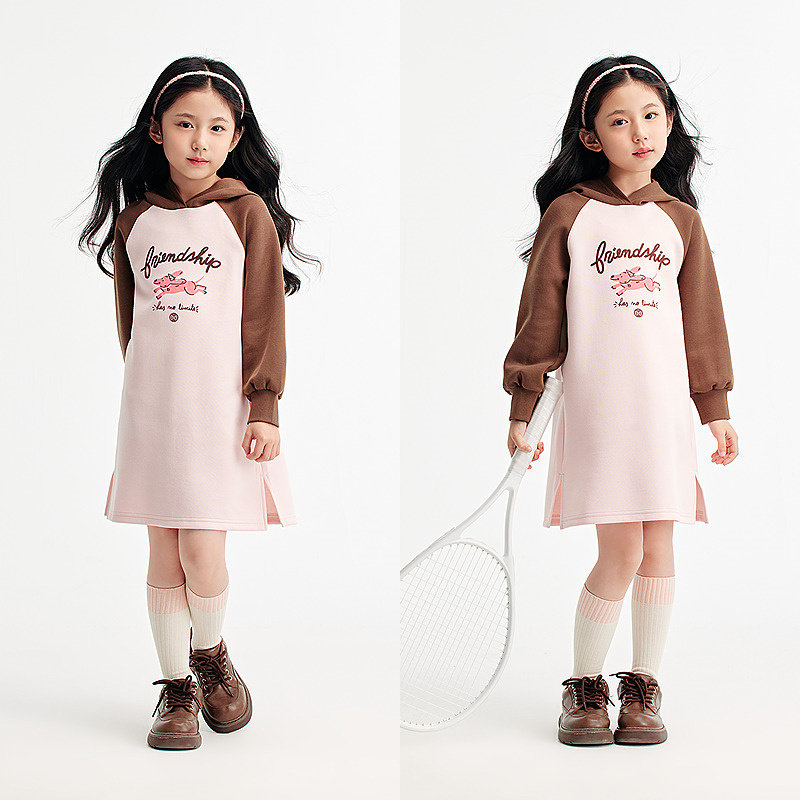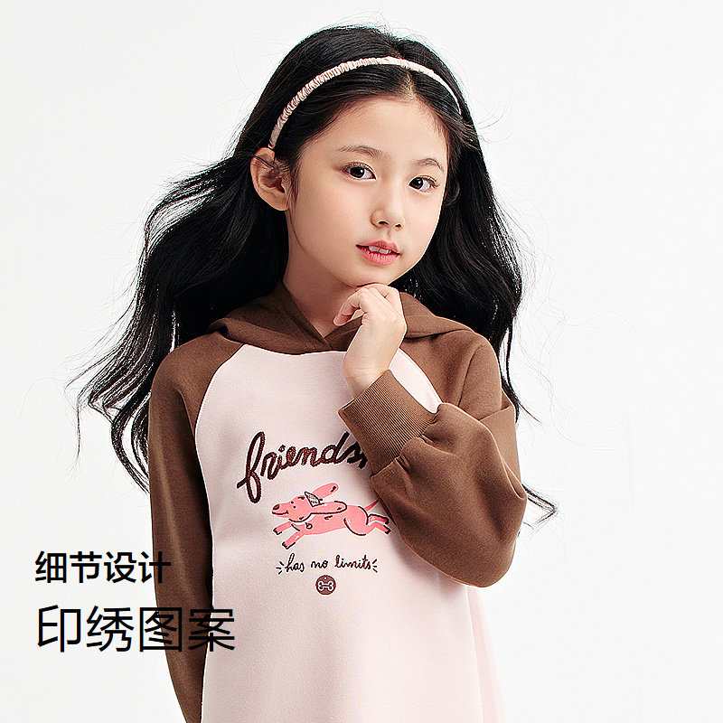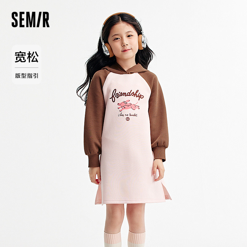 森马儿童连衣裙春季撞色宽松连帽卫衣裙女童甜美小狗印花裙子开叉