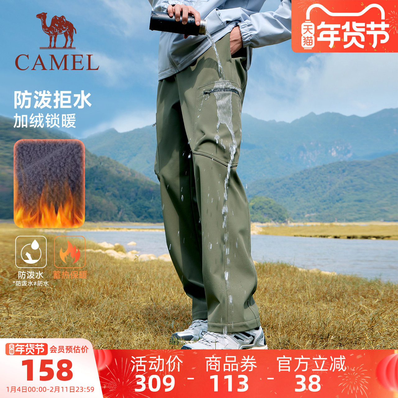 【防泼水】骆驼运动工装加绒裤男冬季直筒伞兵软壳裤户外暖登山裤