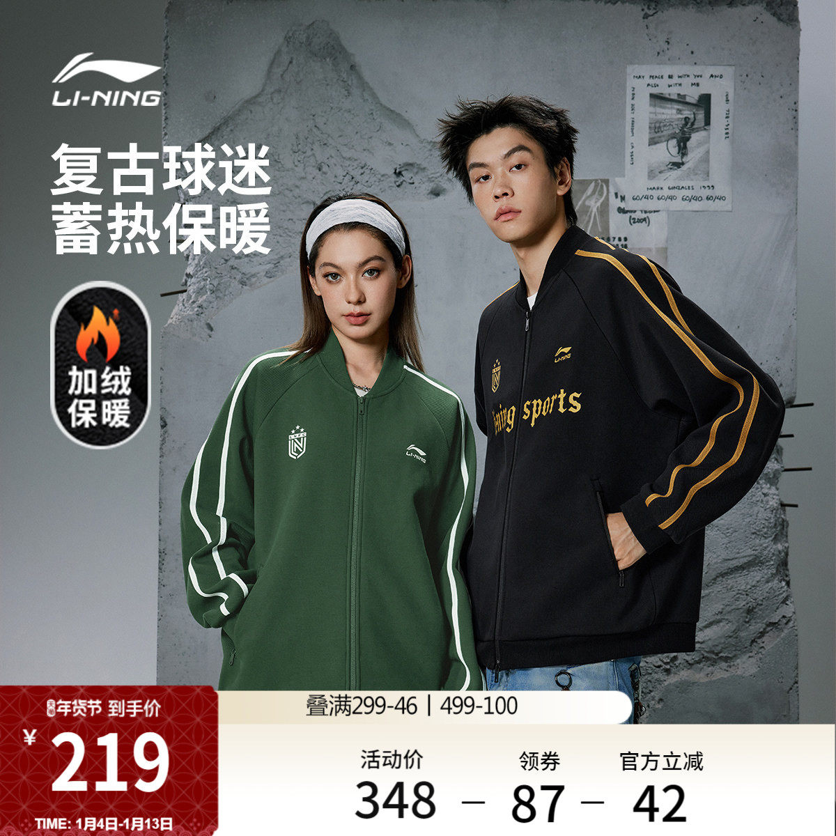李宁加绒棒球服男士冬季情侣美式卫衣复古宽松上衣运动夹克外套女