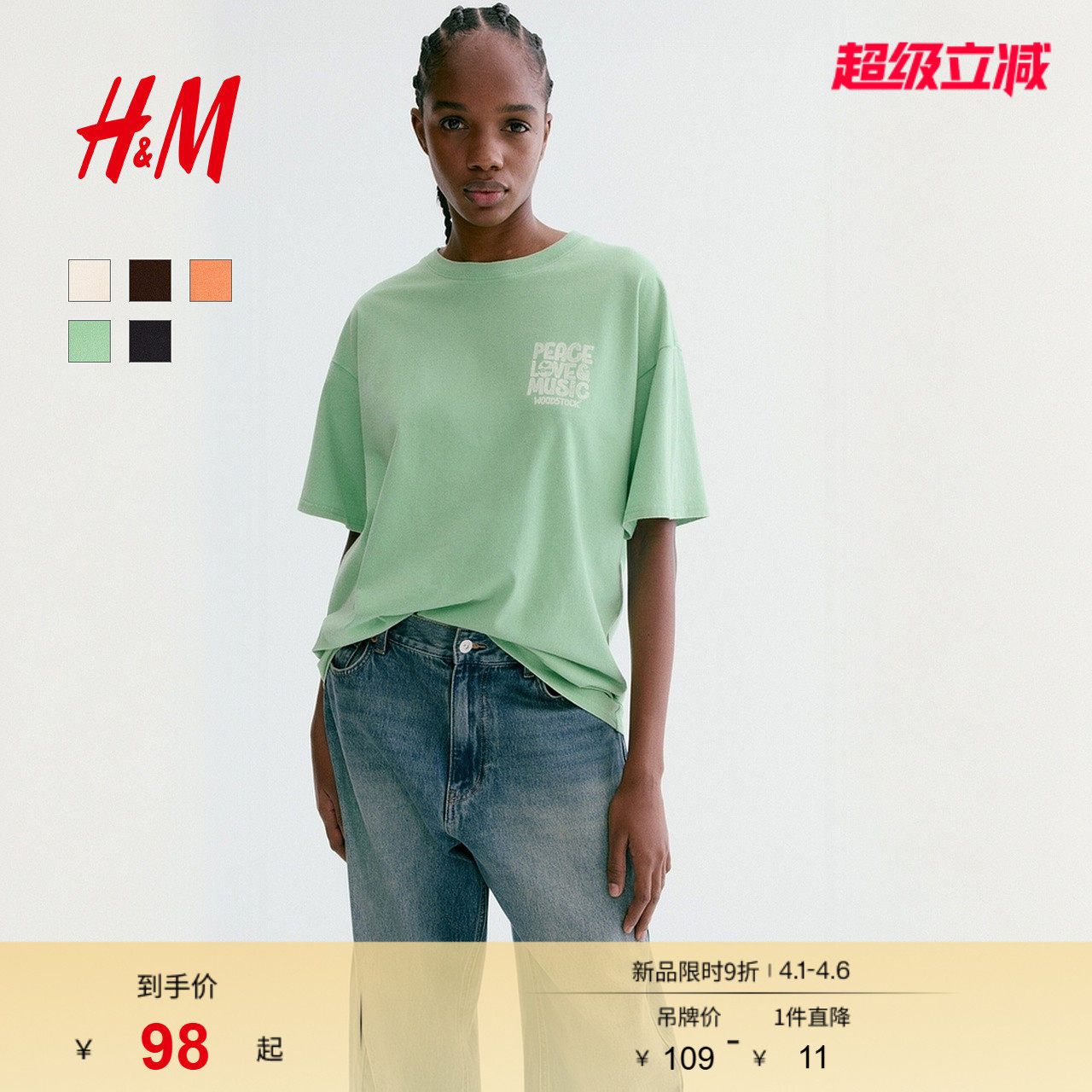HM女装T恤2026春季新款乐队圆领印花图案大廓形短袖上衣1314589