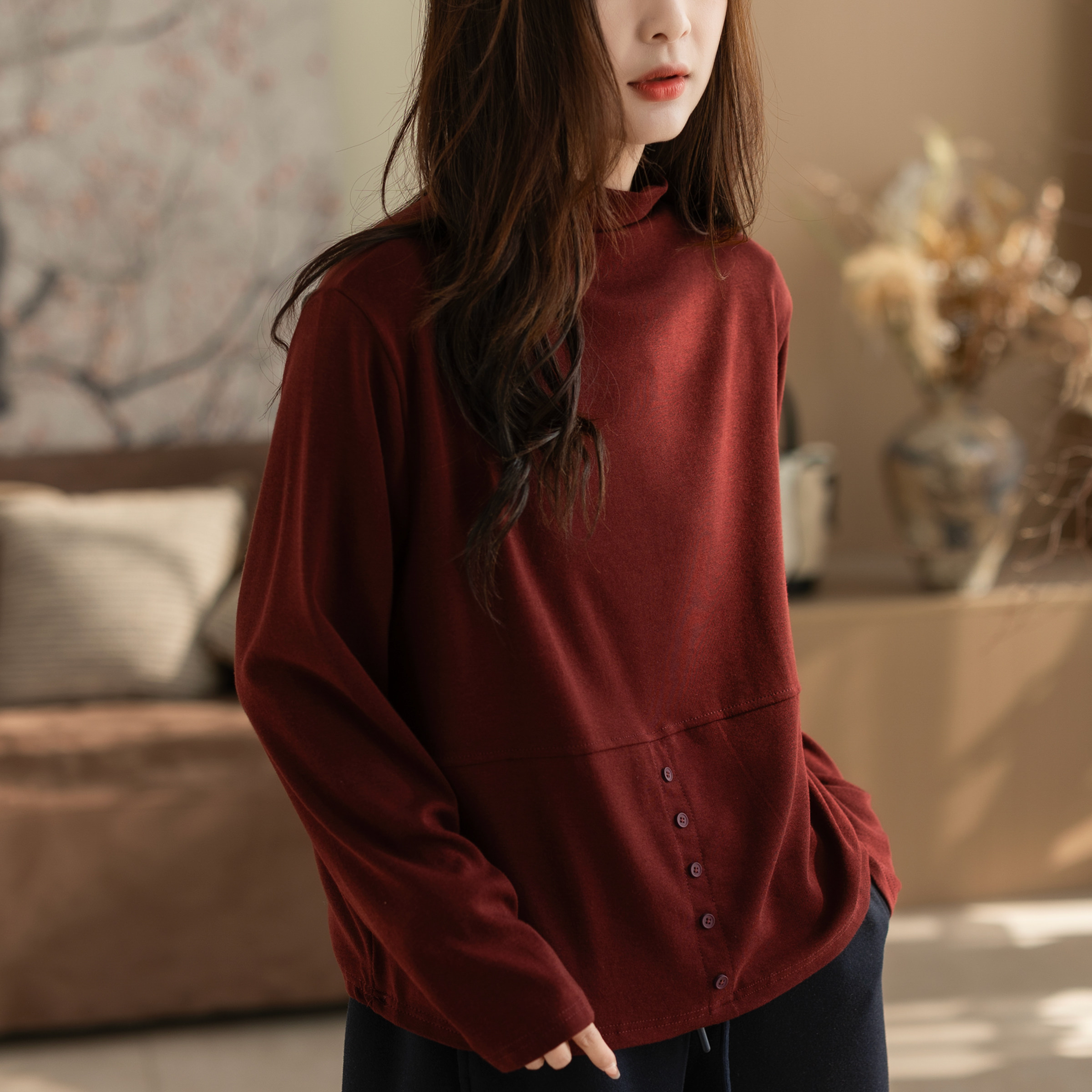 咖咪羽打底衫女秋冬新款高领文艺休闲女士复古宽松纯色女装上衣
