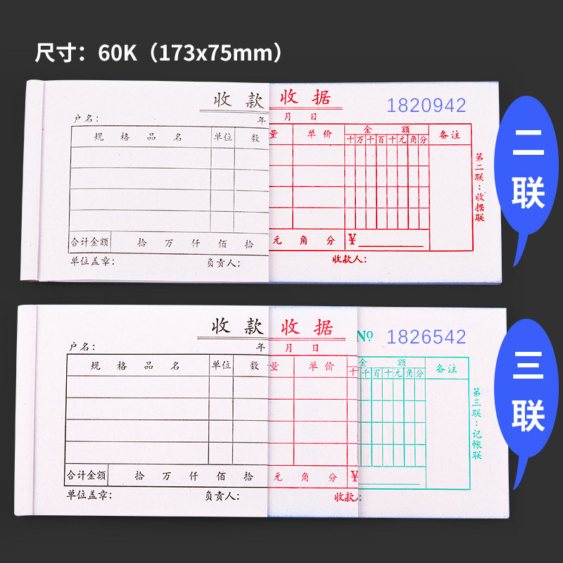 收款收据单栏多栏二联三联23联连两联本单簿收款本现金收剧单据锯无碳复写餐饮财会财务用品蓝色粉红色白色