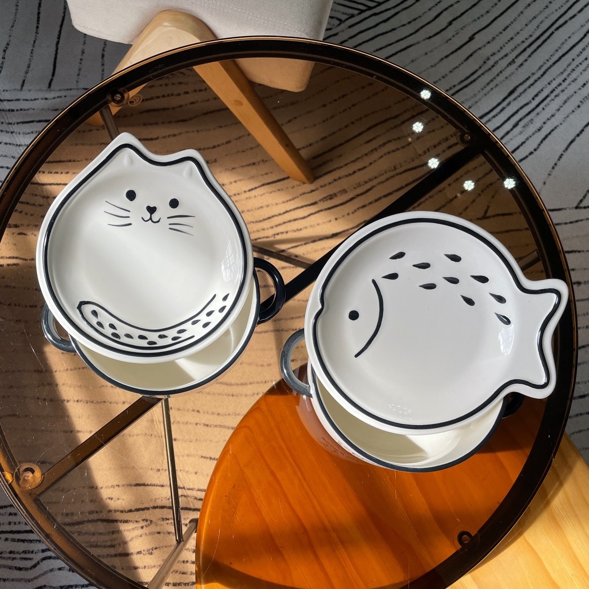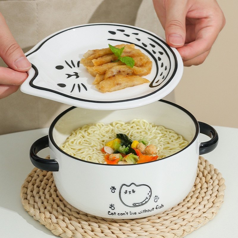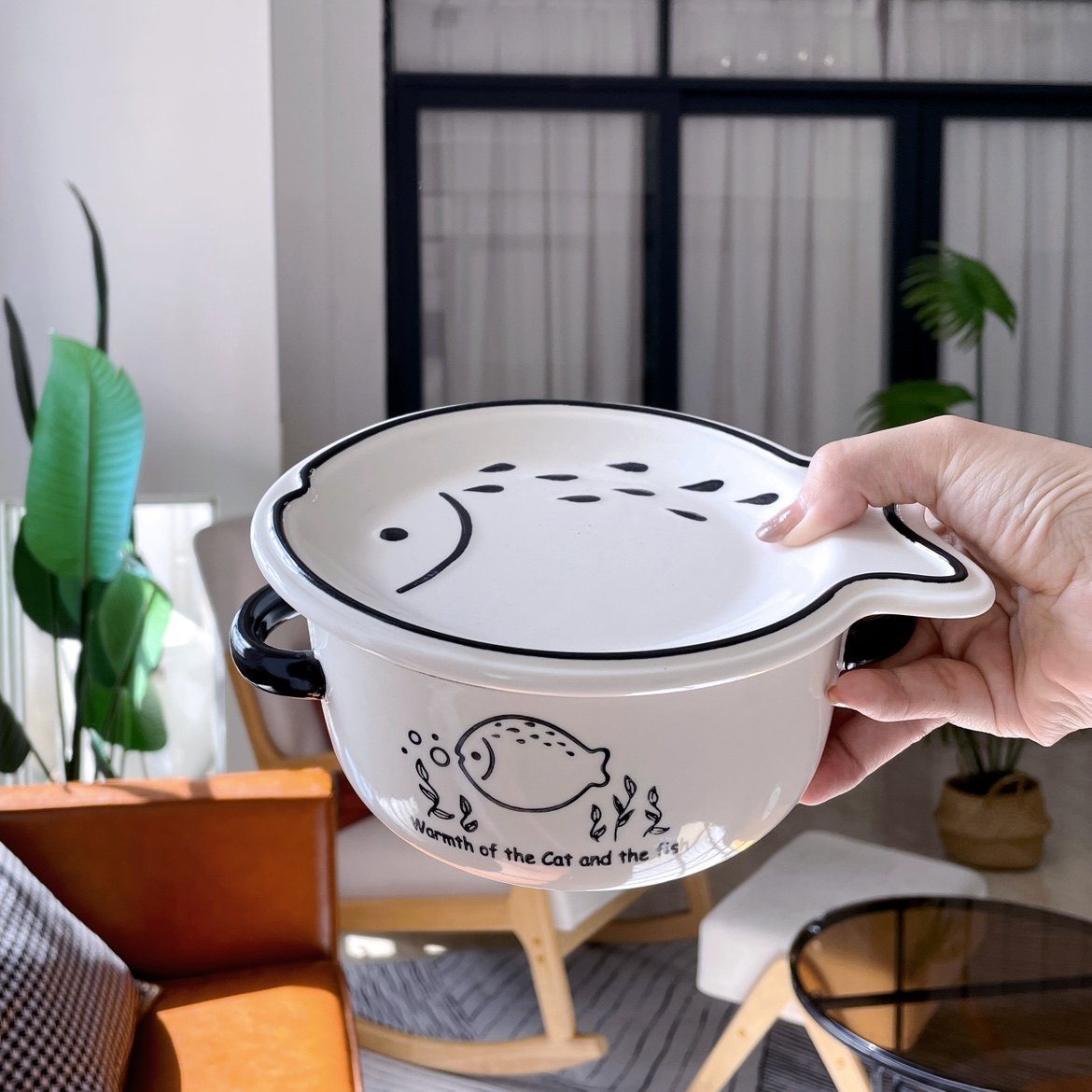 高颜值卡通可爱陶瓷陶瓷碗鱼猫带盖双耳汤碗大号学生宿舍泡面碗
