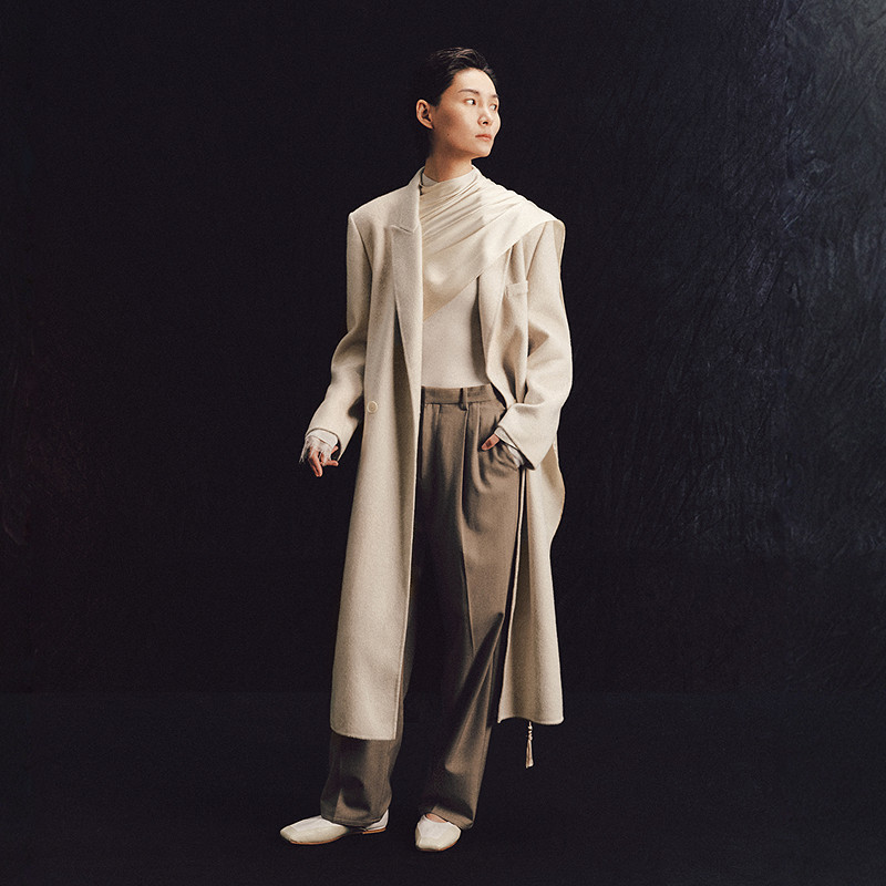 RUISHI芮时重磅驼绒桑蚕丝羊毛慵懒两穿领灰色毛呢大衣秋冬外套女