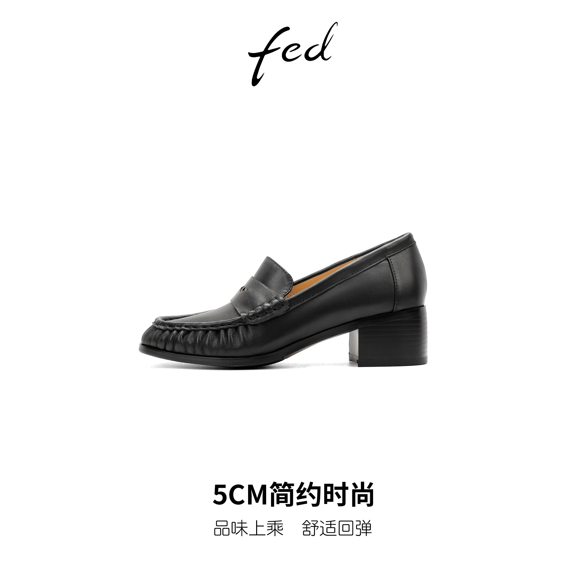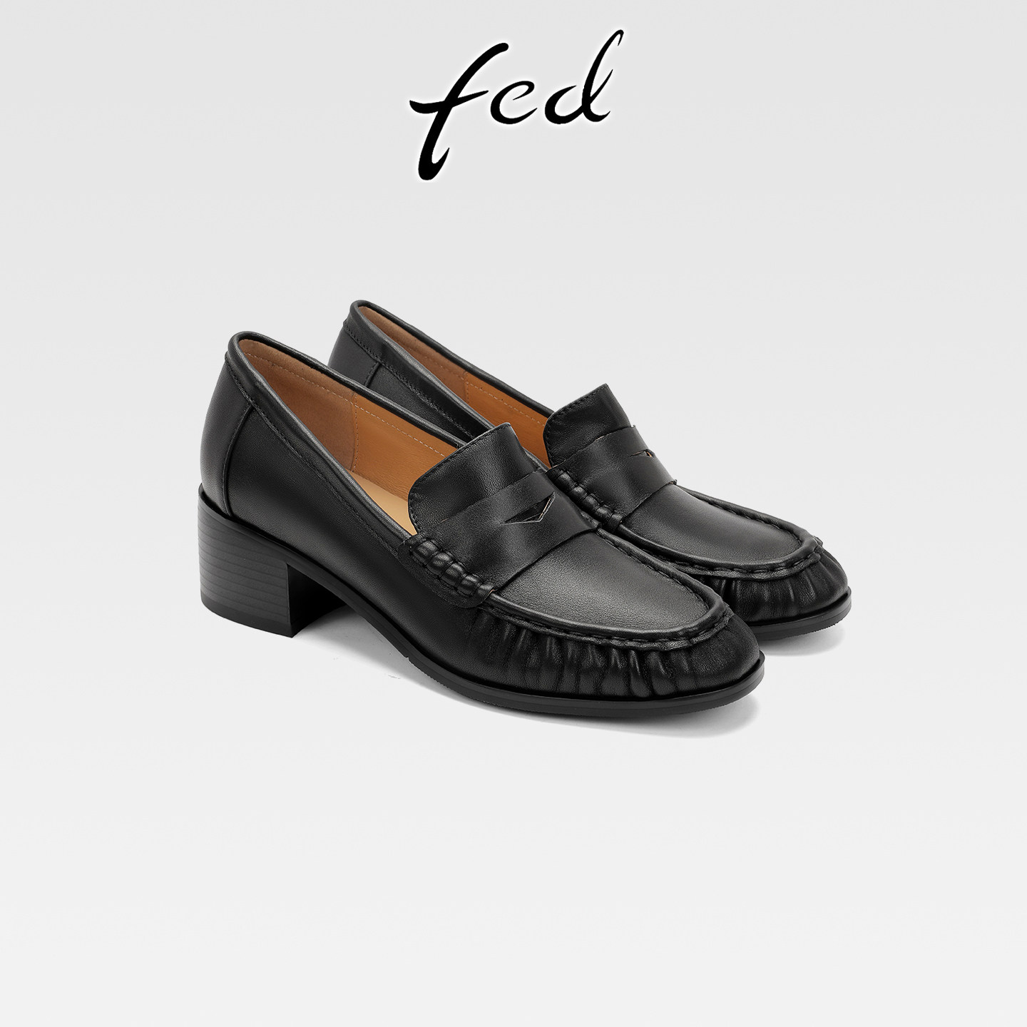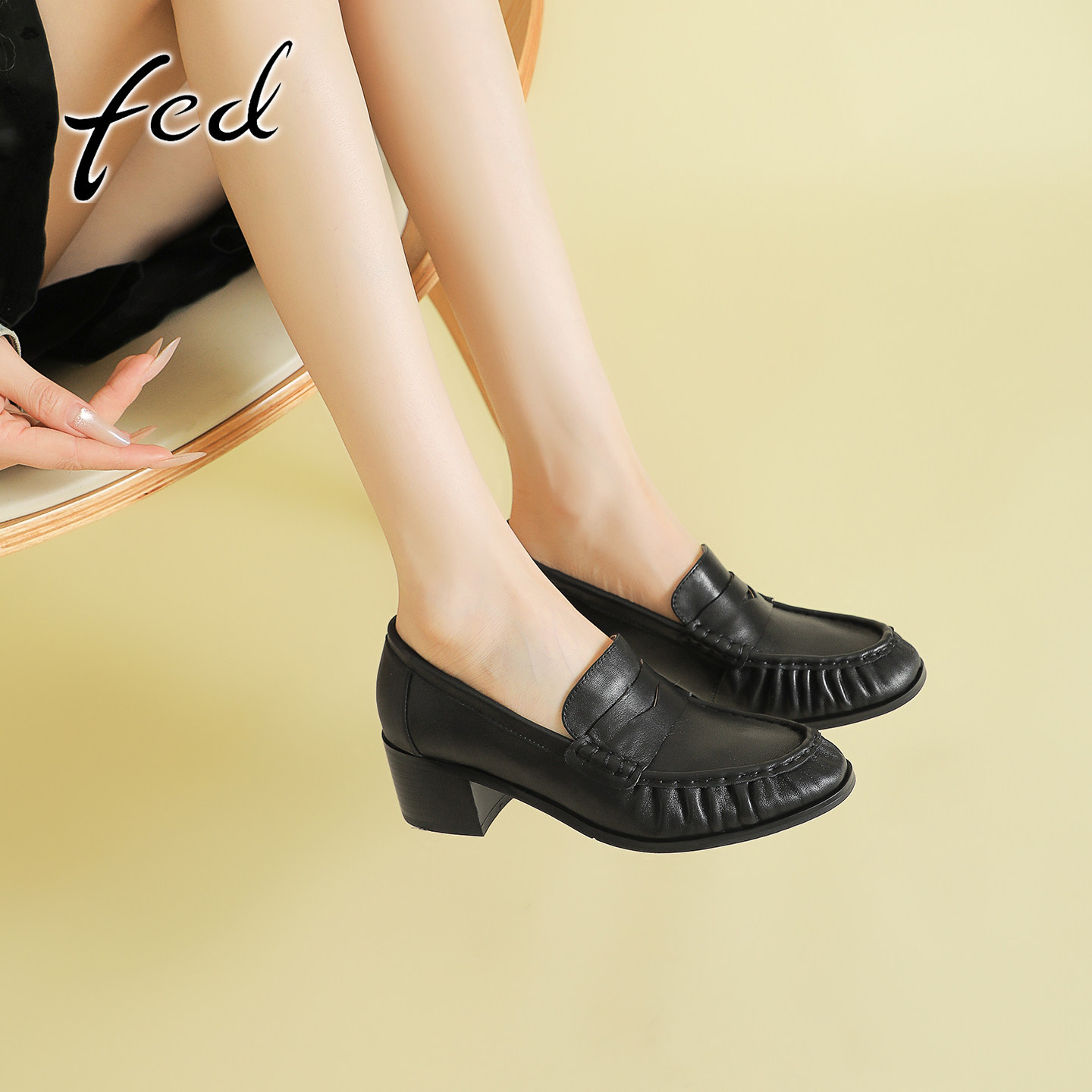 fed真皮粗跟乐福鞋女复古褶皱小皮鞋春秋新款一脚蹬圆头深口单鞋