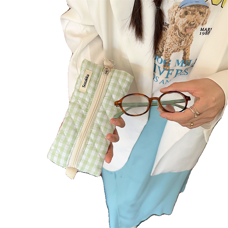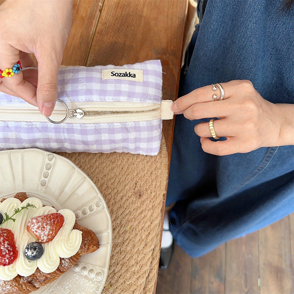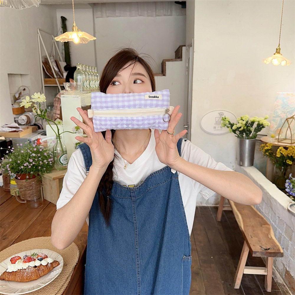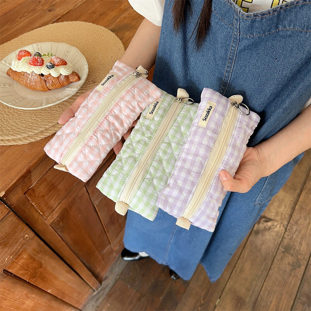 大容量绗缝清新格子笔袋文具盒铅笔盒韩系杂物零钱收纳包