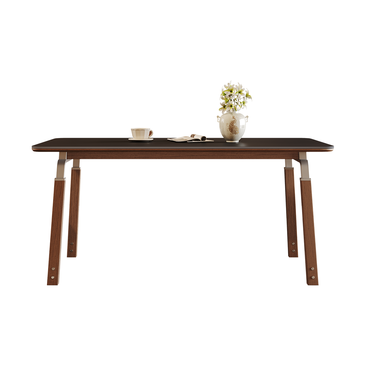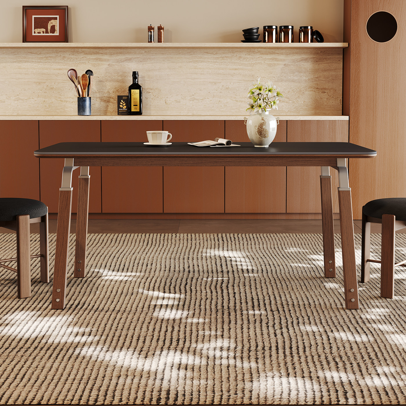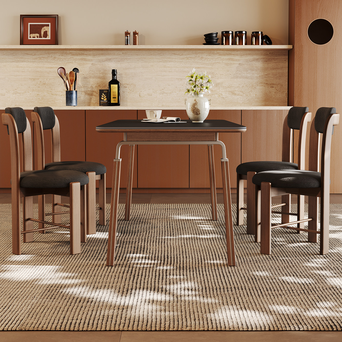 包豪斯黑色岩板餐桌长方形家用胡桃色设计师新款中古风实木餐桌