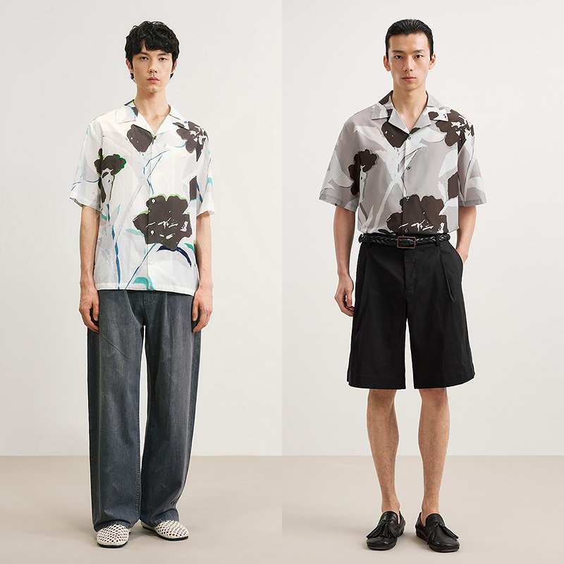 速写男装春夏新款男士衬衫手绘石榴花短袖衬衫夏威夷领上衣度假感