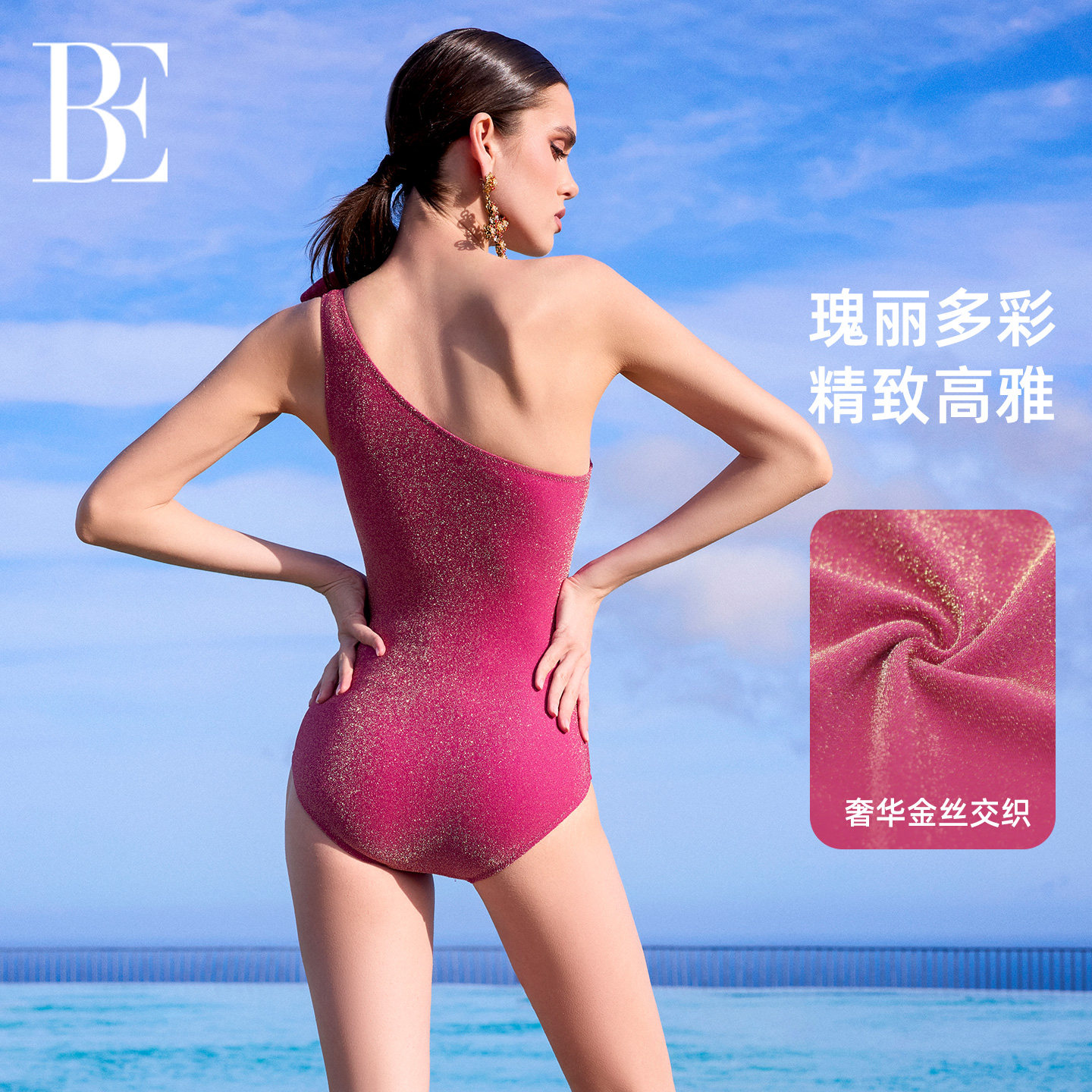 玫红色金丝纤维面料,单肩设计,新颖时尚