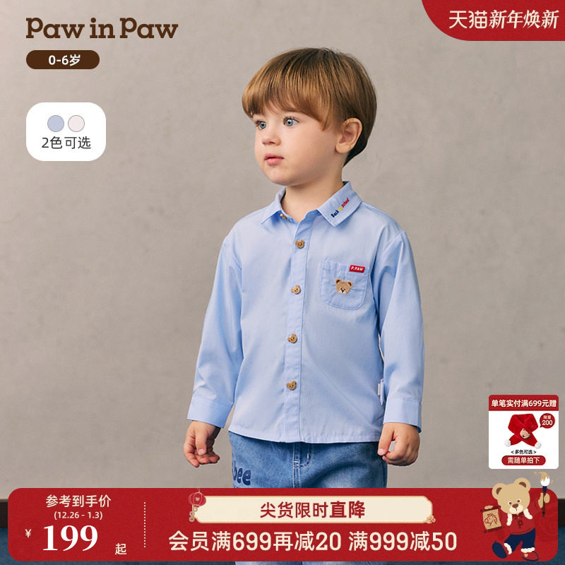 PawinPaw卡通小熊童装26年新款男宝宝儿童翻领学院风衬衫可爱宽松