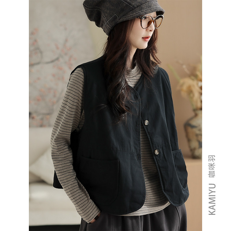 咖咪羽复古文艺秋季新款气质百搭圆领单排扣宽松开衫通勤马甲坎肩