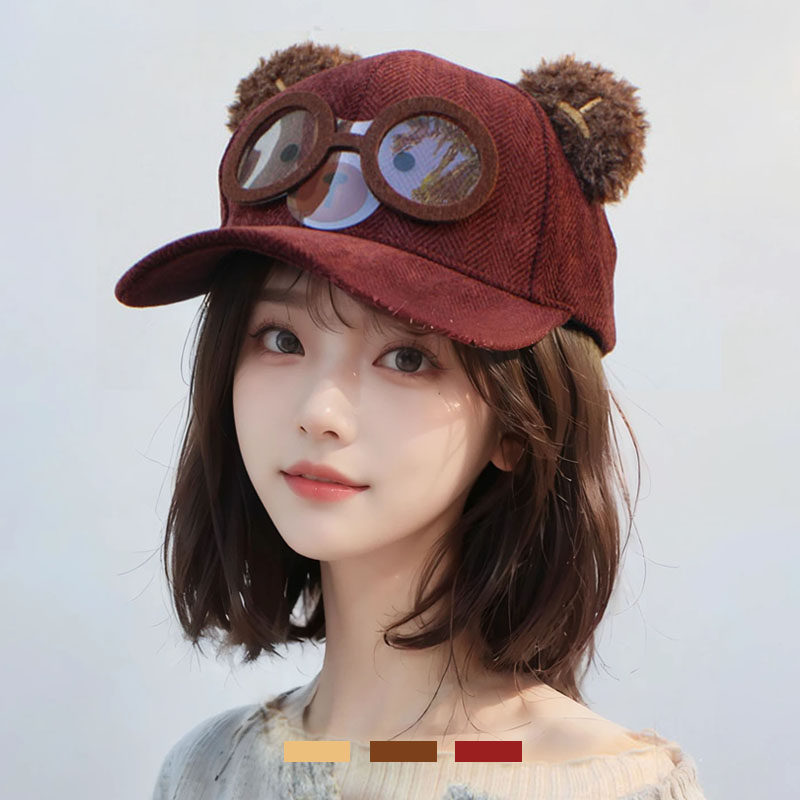 ins秋冬毛呢料可爱眼镜小熊帽子女耳朵棒球帽女甜美显脸小鸭舌帽