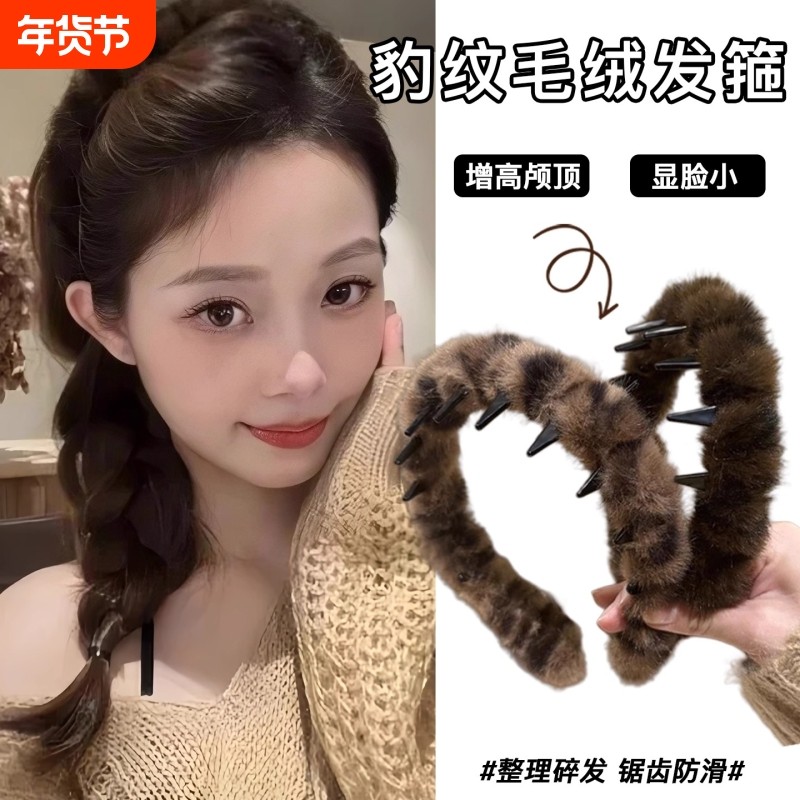 韩系复古豹纹带齿毛绒发箍女高颅顶防滑洗脸发卡头箍2025年秋冬