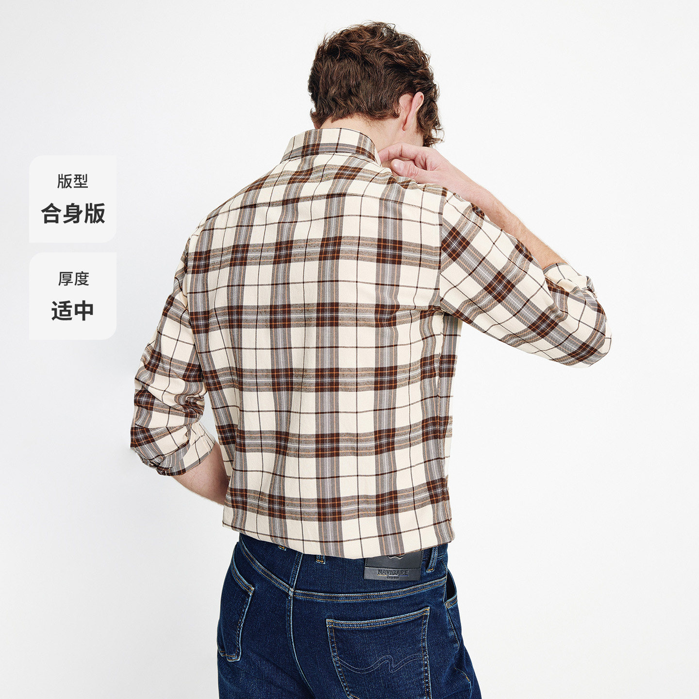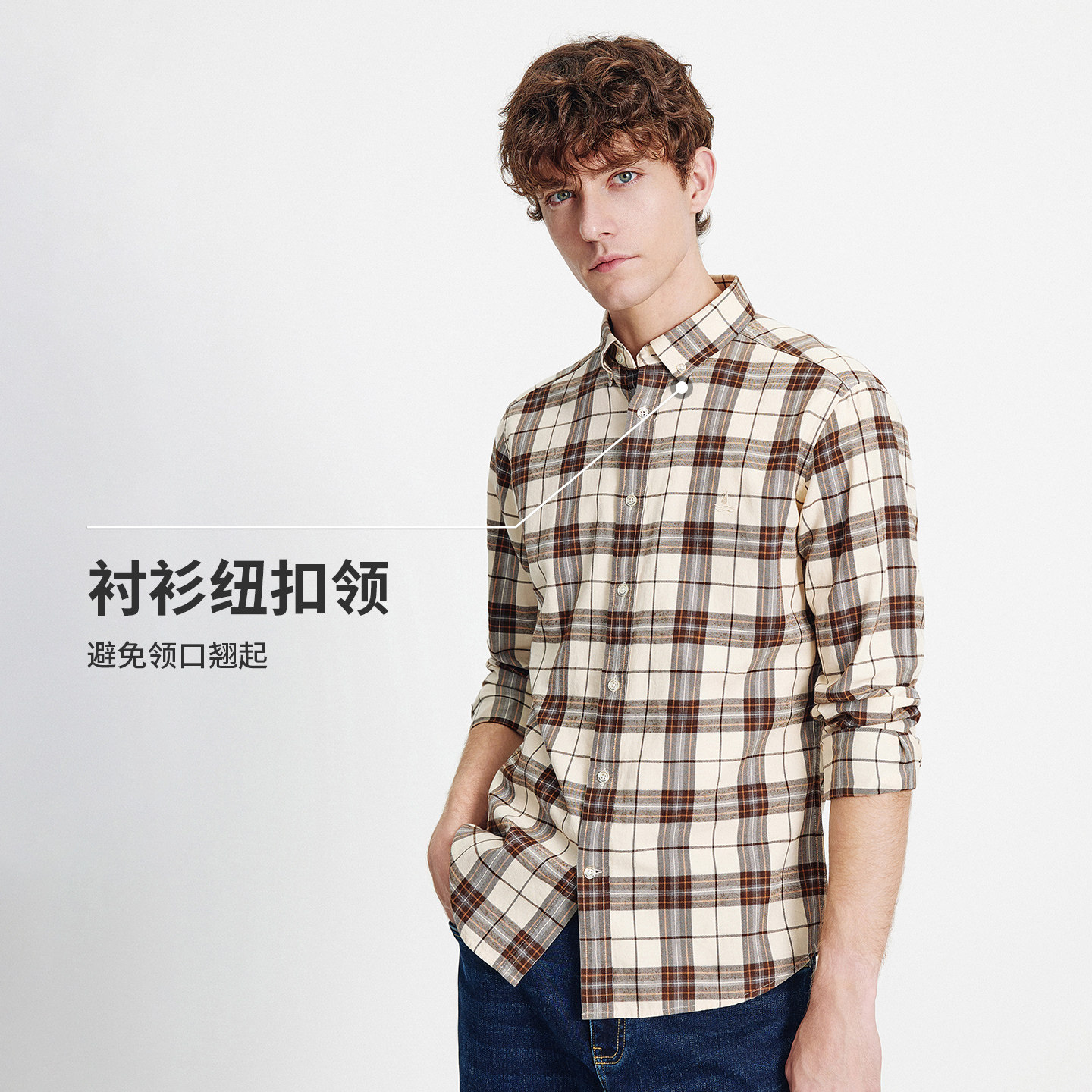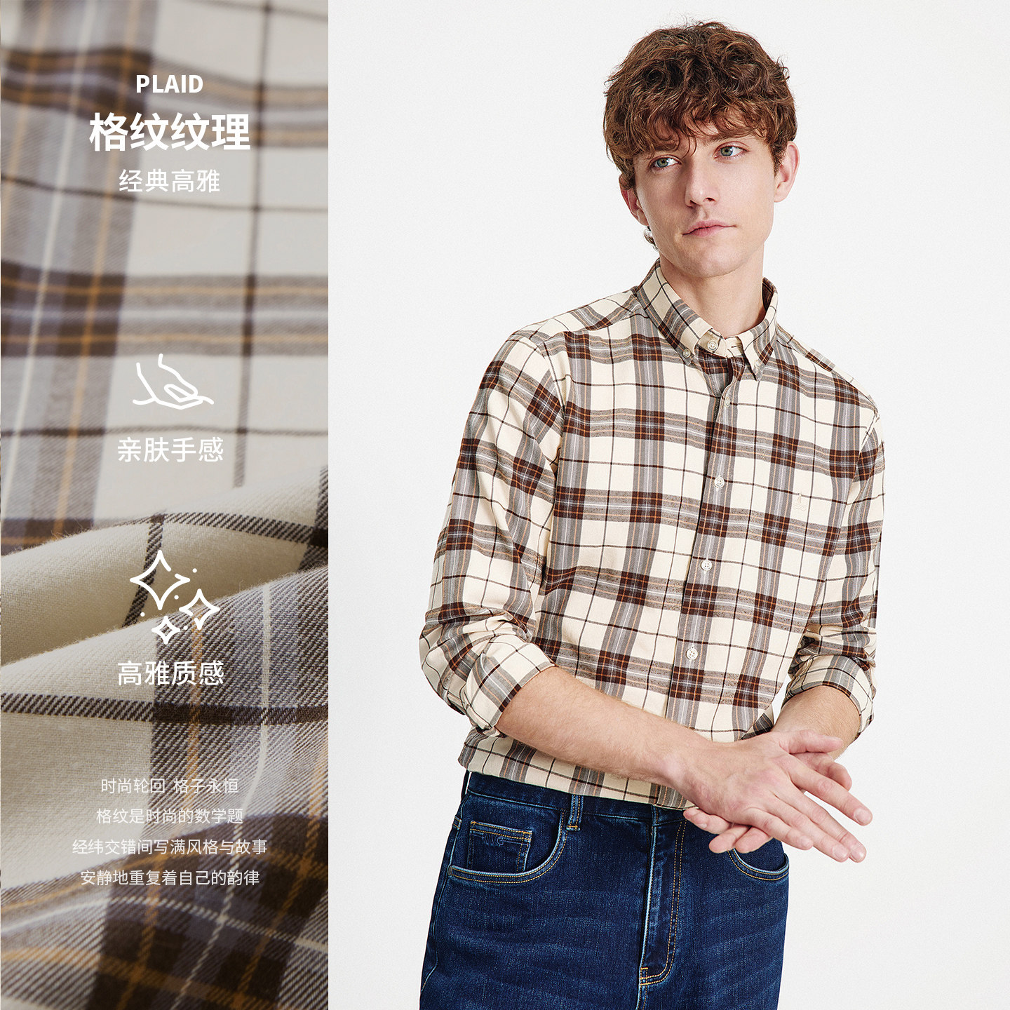 啄木鸟秋季新款男士长袖100%全纯棉磨毛格子衬衫 高级感休闲衬衣