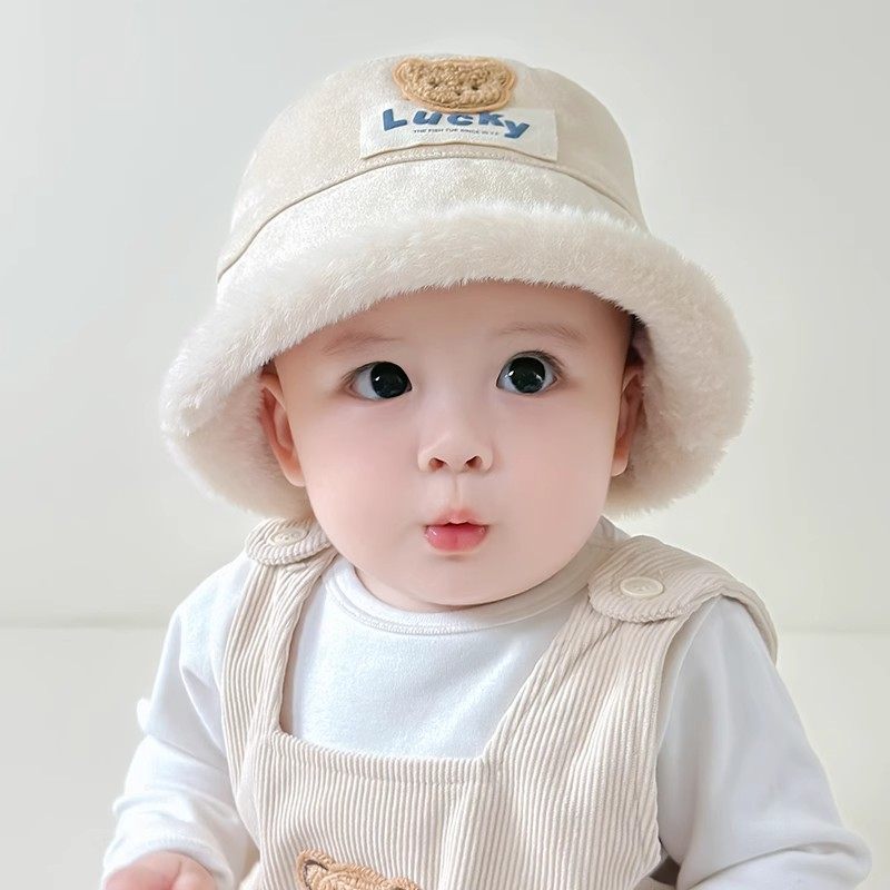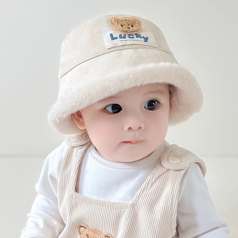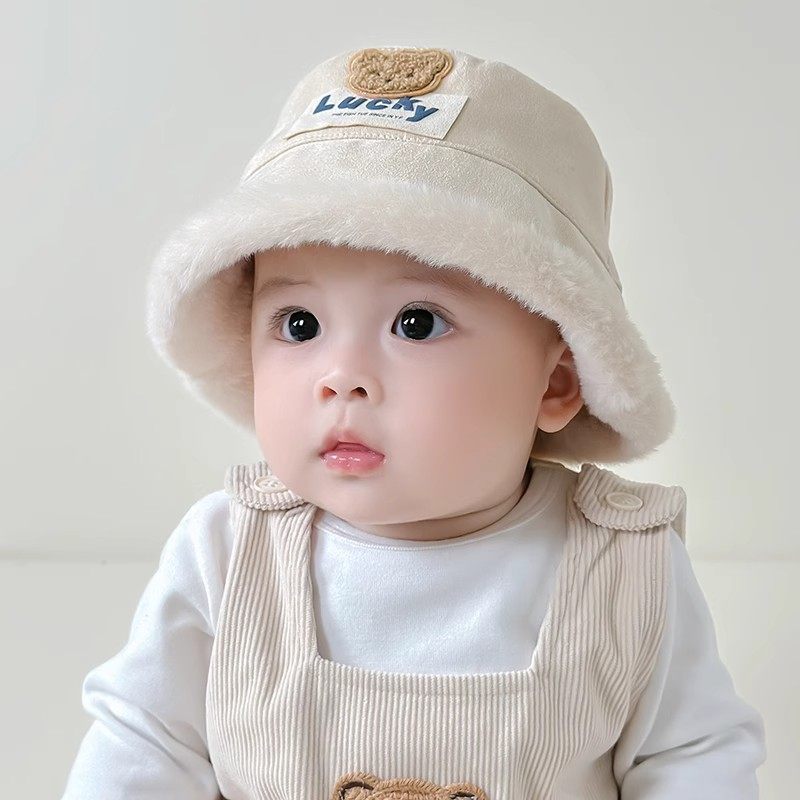 婴儿帽子秋冬季男宝宝渔夫帽加绒保暖防风外出帽子小熊宝宝毛绒女