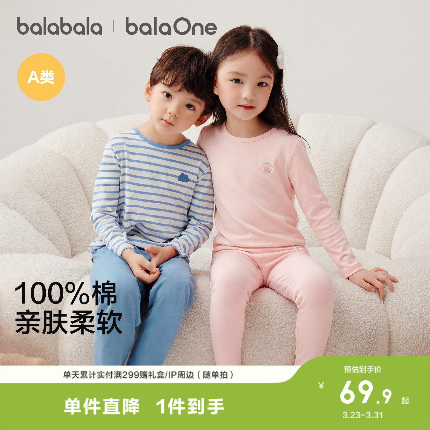 巴拉巴拉儿童内衣套装纯棉男童空调衣小中大童女童新品打底睡衣软