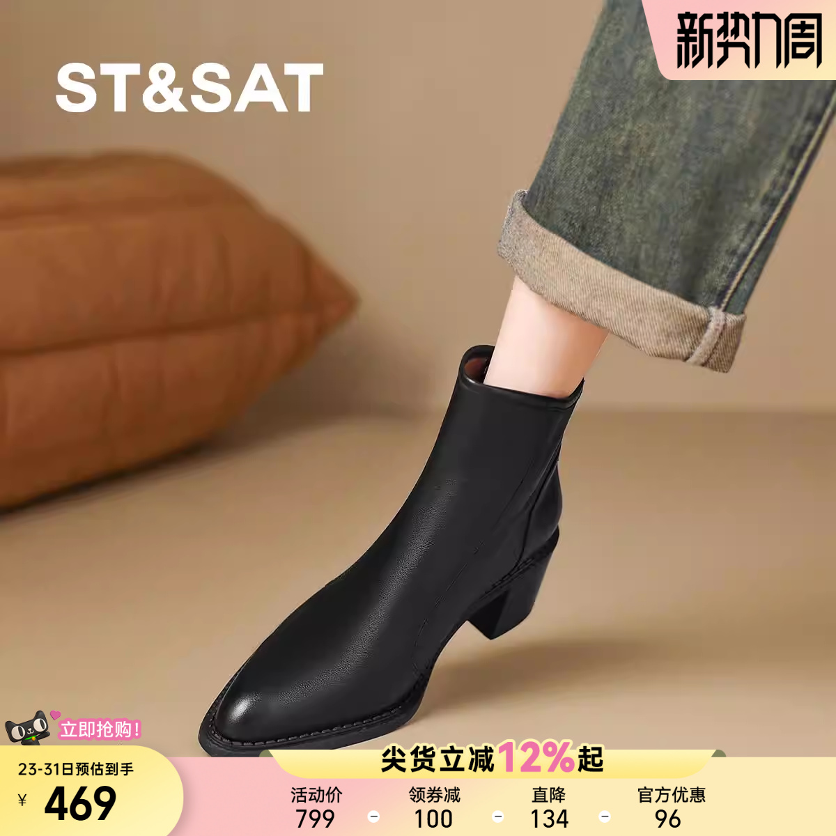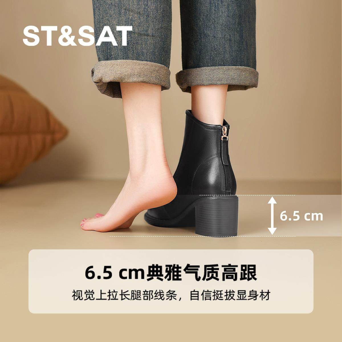 星期六2025新款黑色粗跟短靴女中跟踝靴冬季加绒保暖厚底瘦瘦靴
