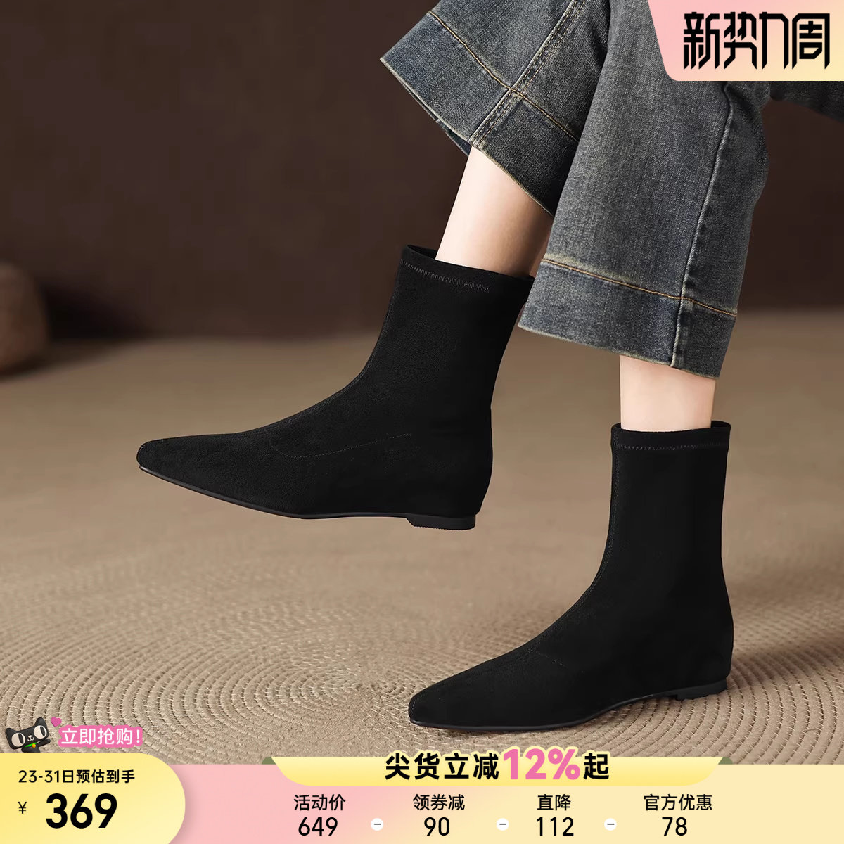 星期六黑色短靴女秋冬新款复古绒面靴子气质尖头瘦瘦靴平底靴