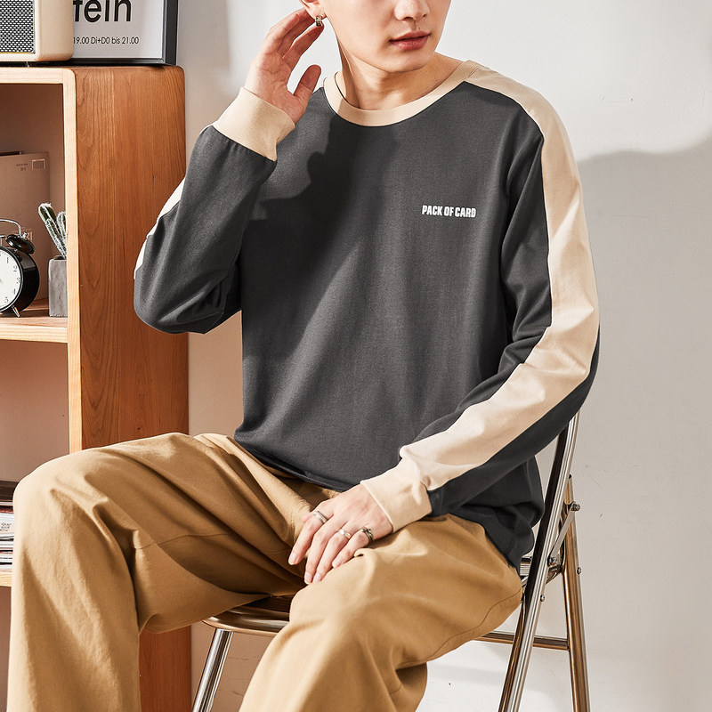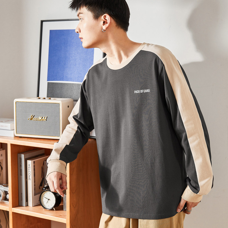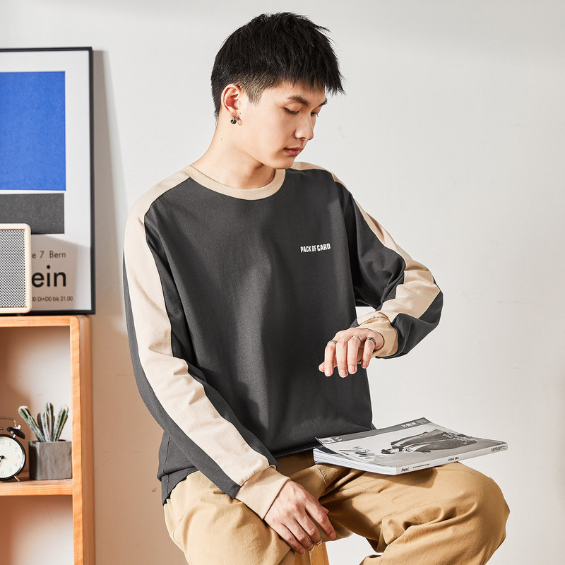 唐狮秋长袖T恤男士撞色拼接显瘦上衣宽松男士潮流港风打底衫男士4