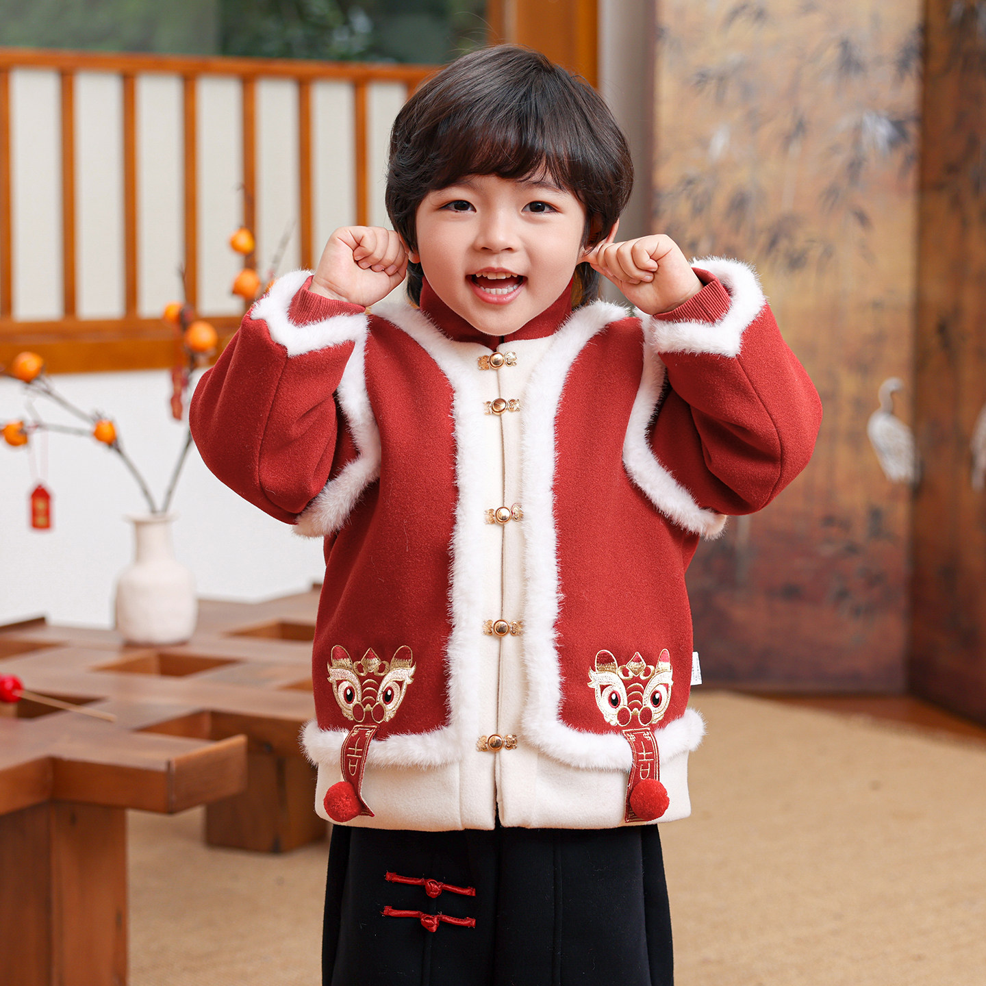 婧麒宝宝汉服套装冬装周岁礼服儿童中式国风唐装冬季红色拜年衣服